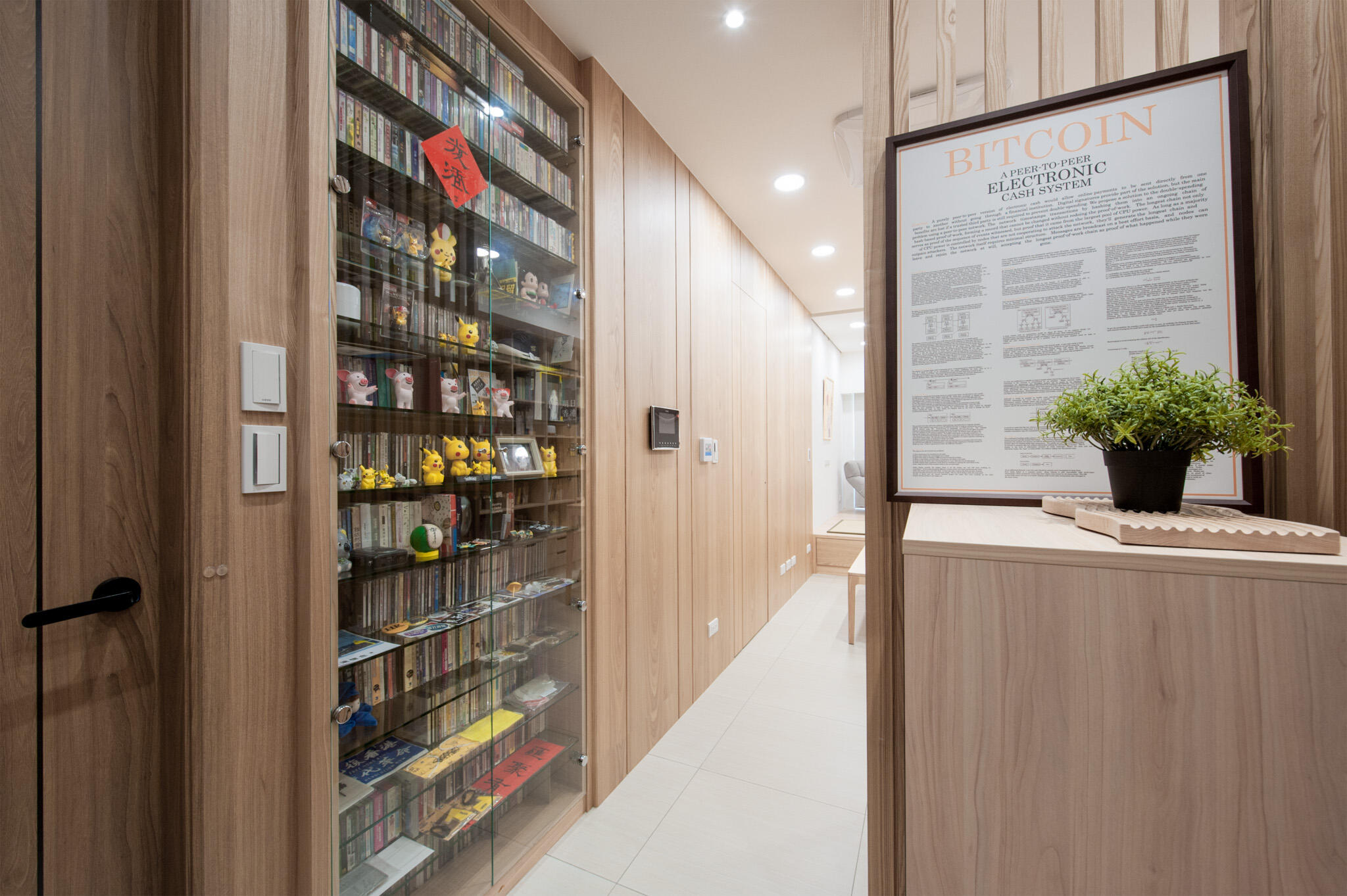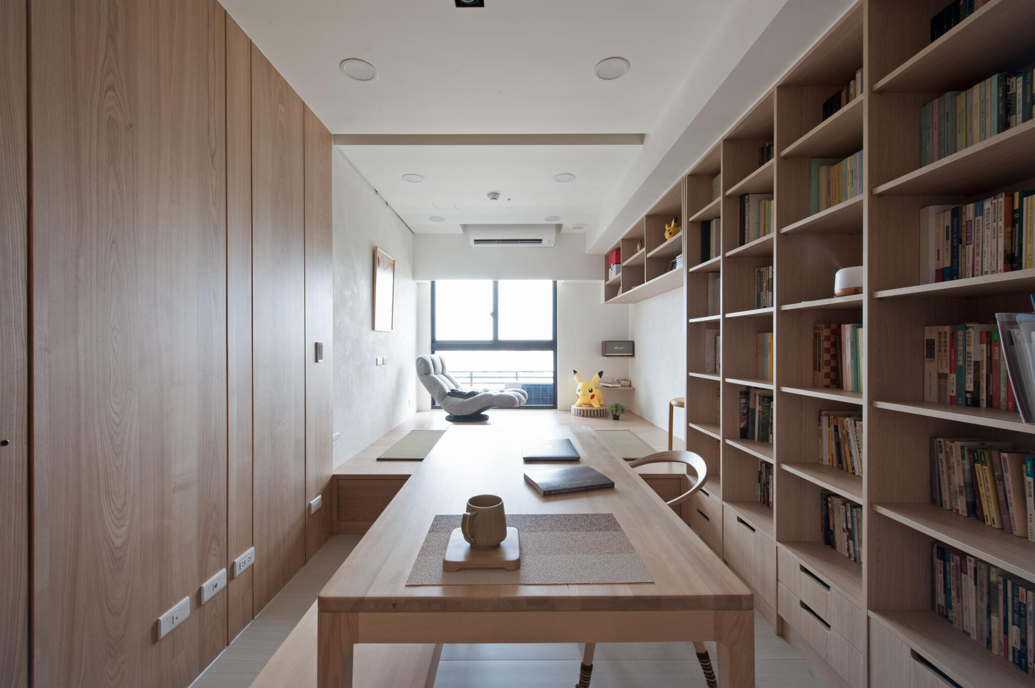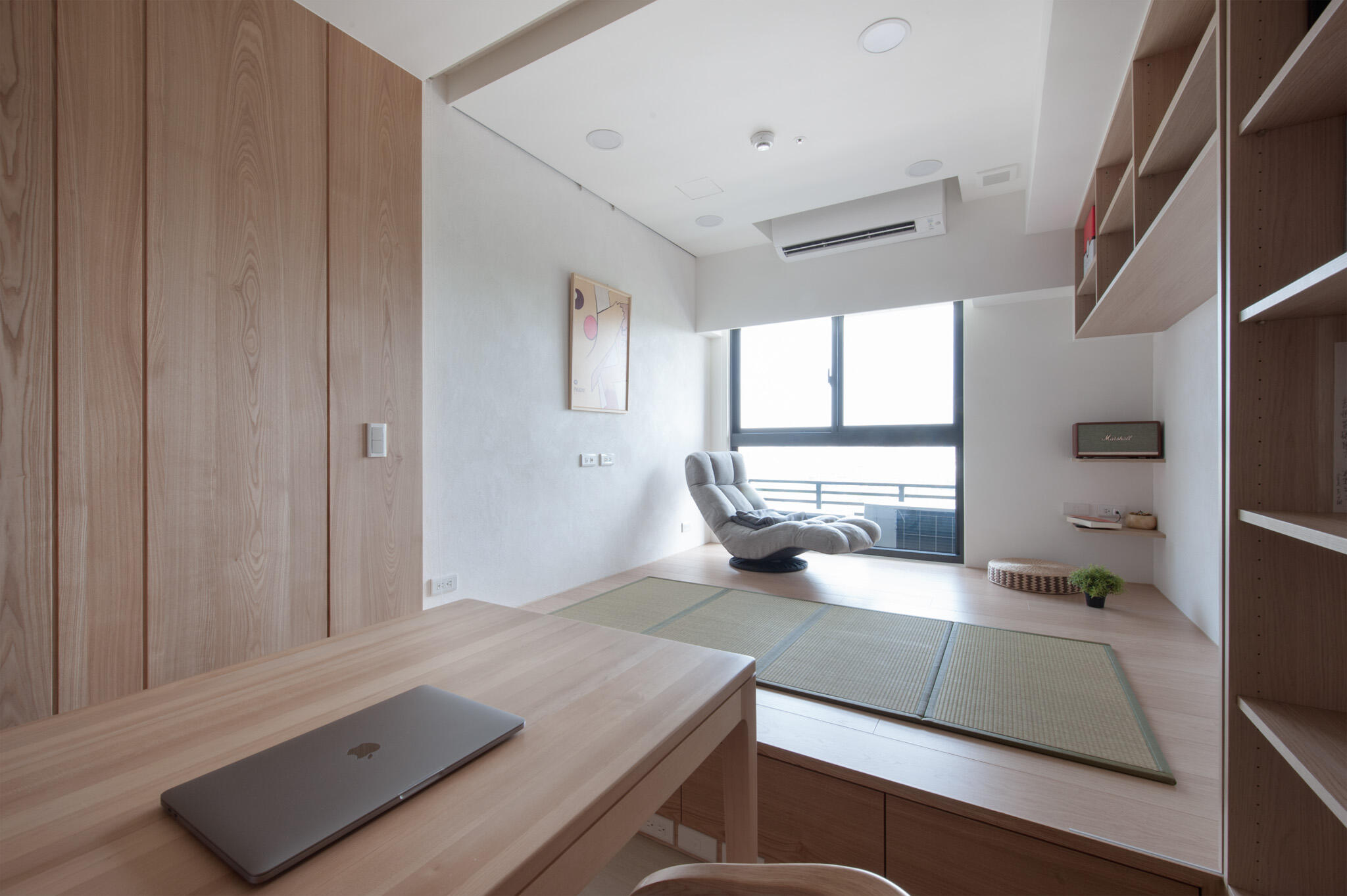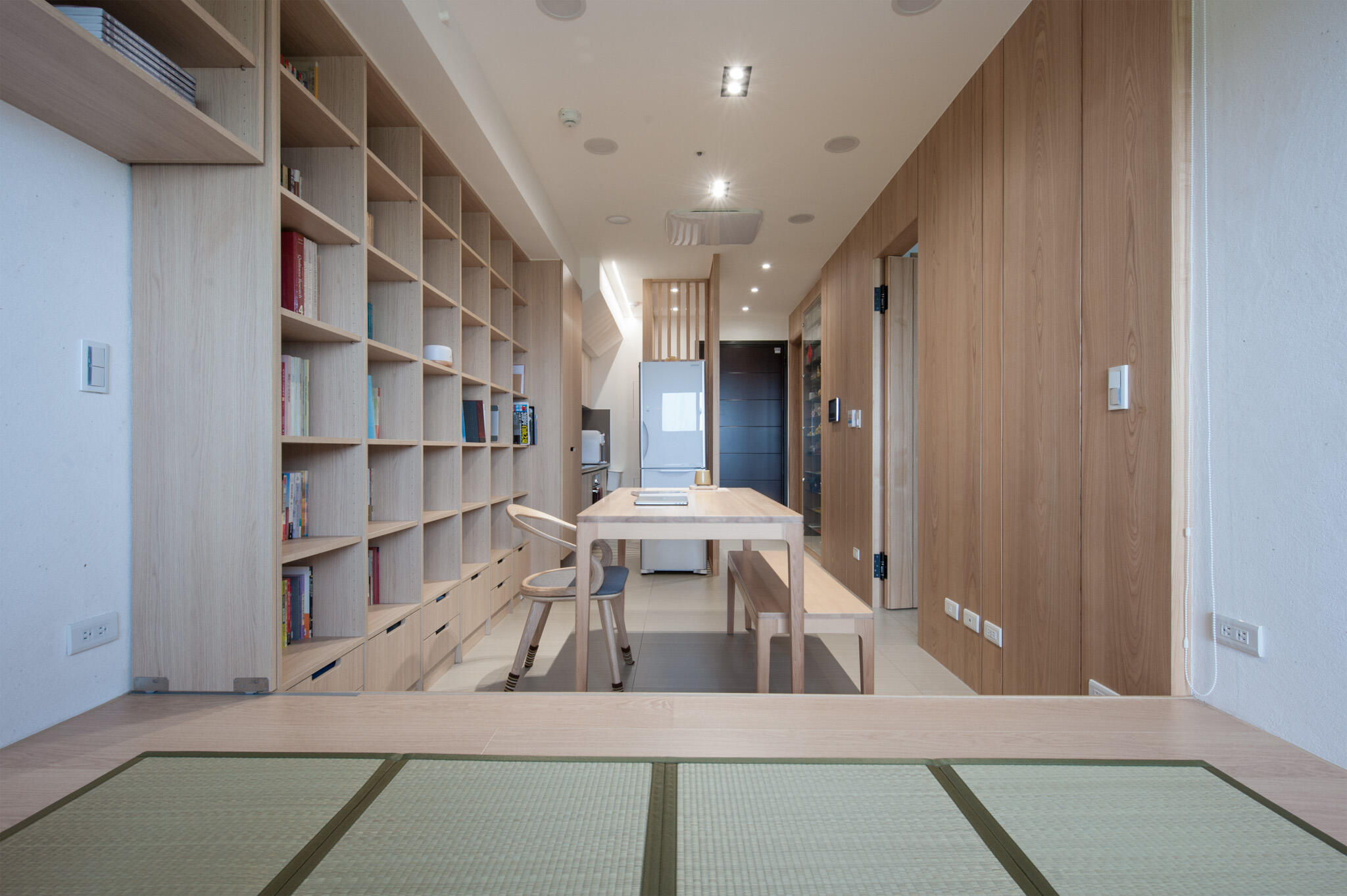 屋主偏愛沉靜的禪風意境,設計師以樸實雅致的木紋語彙鋪陳,醞釀出平靜、自然的生活氛圍,入口處為了虛化實心界線以木格柵為運用,緩步進入客廳,整面書牆擺放大量收藏,而在長形空間的底端設置的架高和室,藉由縮短窗台高度,引入窗外大片美景,空氣中伴隨著榻榻米天然藺草的香氣,彷如置身古時日式木屋,在這獨特的美感和文化氛圍下開啟寧靜休憩的生活,從走進家開始,心情便能夠自然地放鬆沉澱。