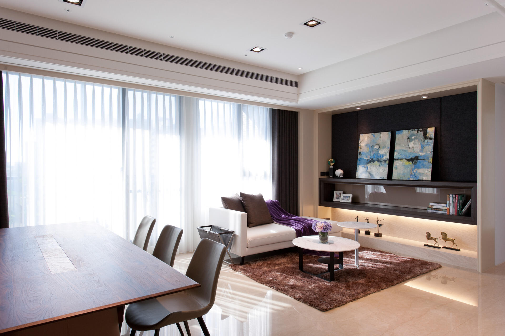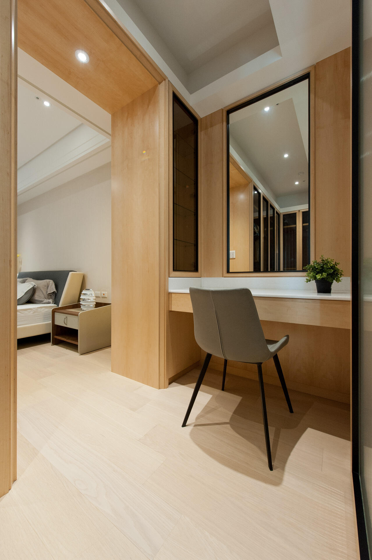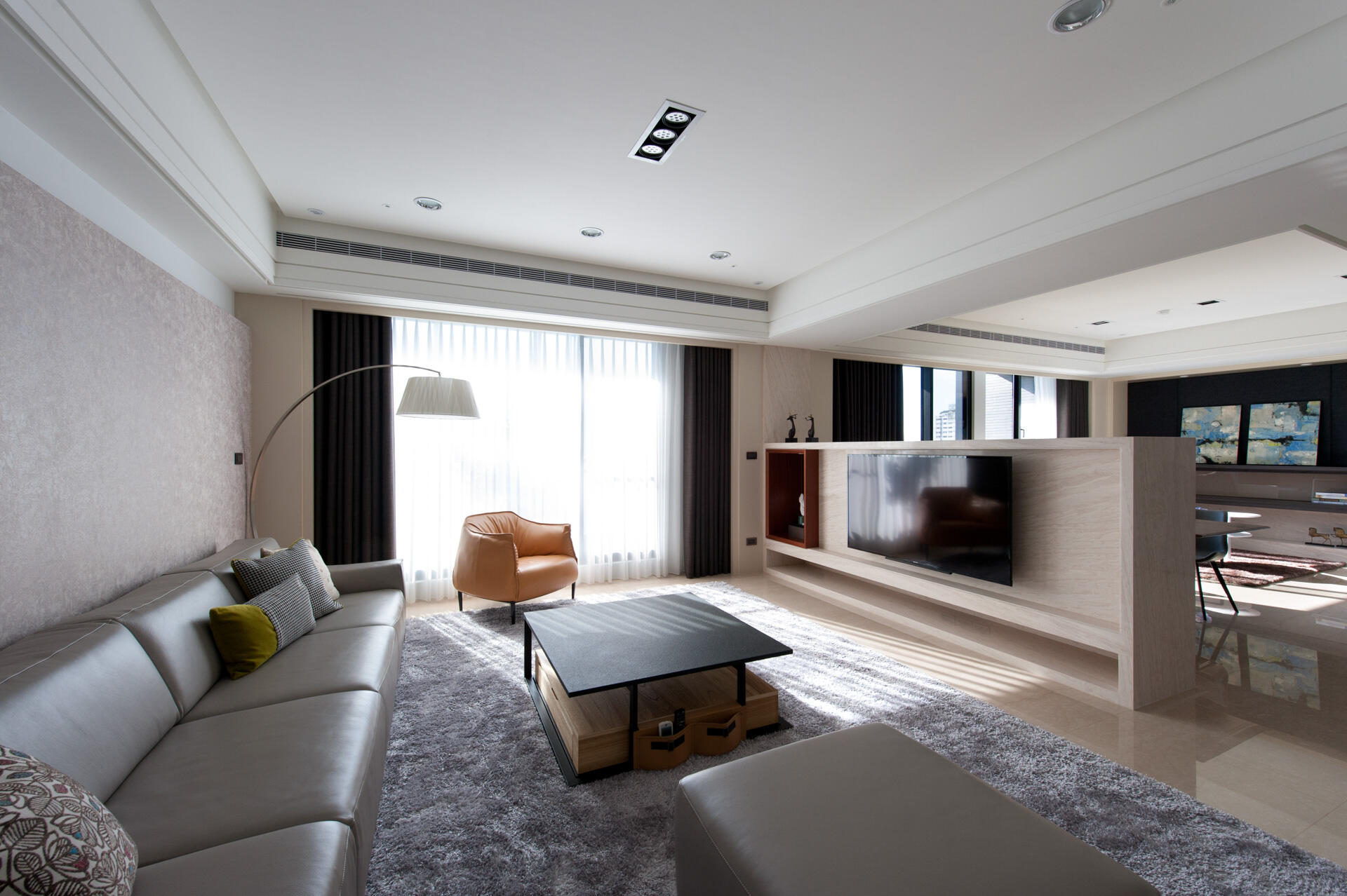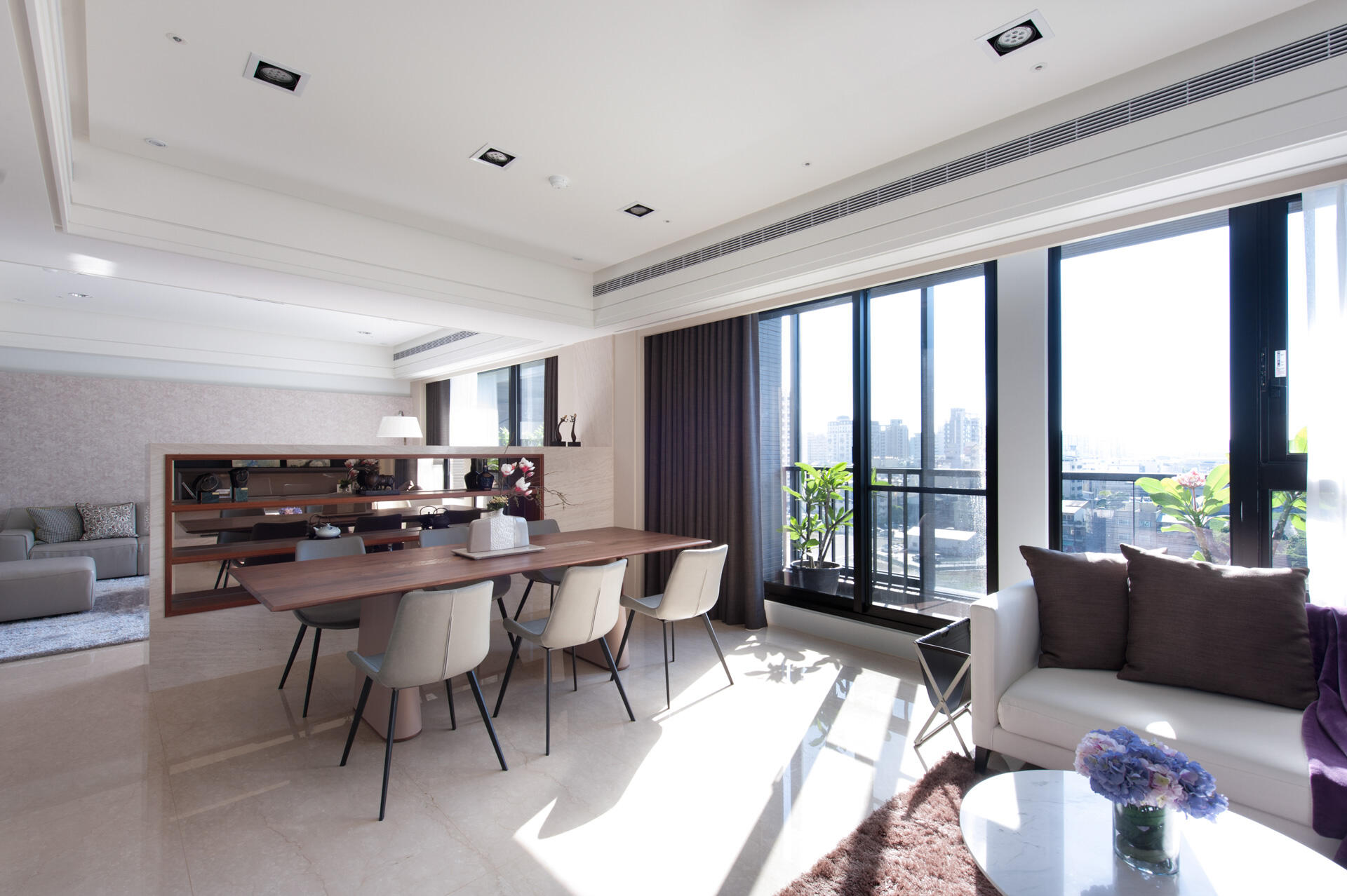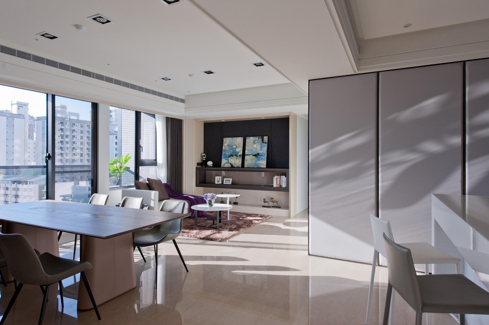 設計師以開闊的空間感為關鍵設計,公領域以開放式格局與大面落地窗導入窗外綠景,虛化室內外界線,電視牆設計成半高牆面,同時結合了餐廳、休憩區、輕食區,既界定了空間,同時保留了開闊感。大量使用木質、石材等天然建材,傾注自然氣韻,用簡約俐落的筆觸,構築出深邃唯美的詩意之境,讓返家即能沉澱心靈,拾得一片寧靜。