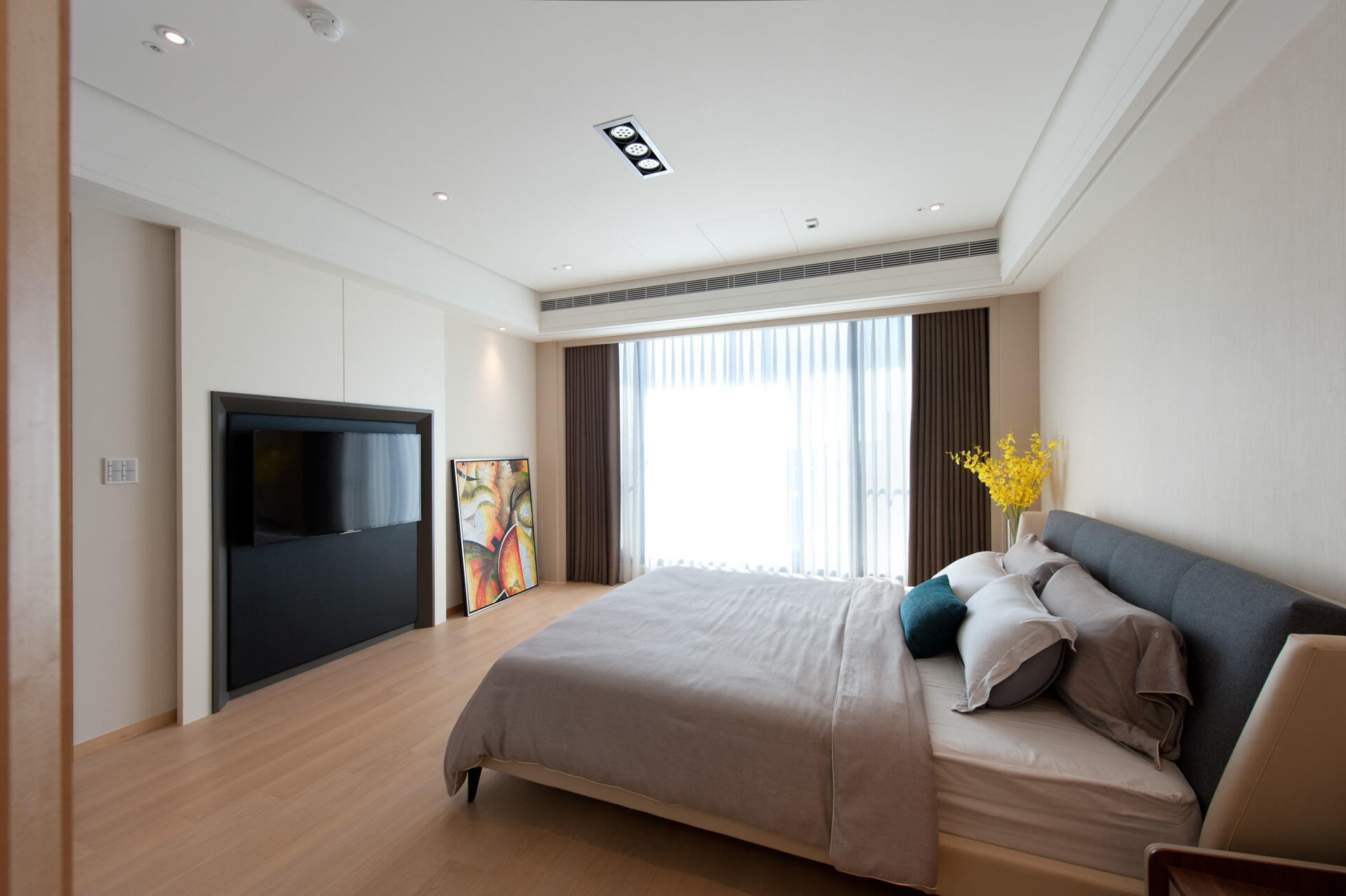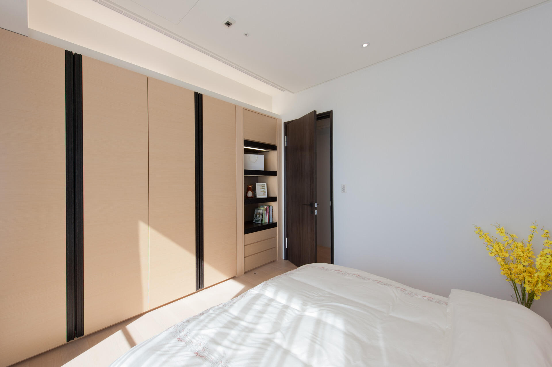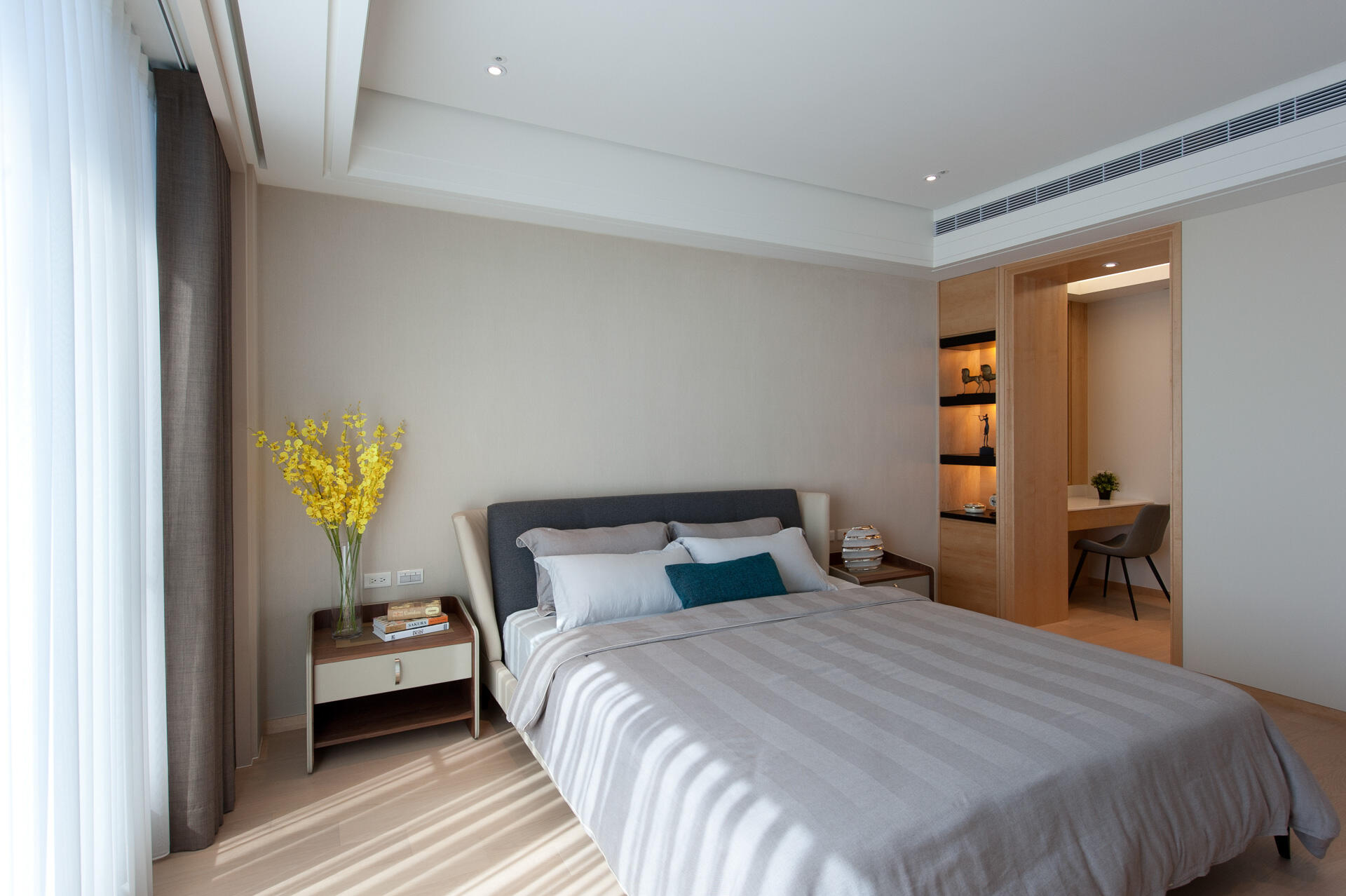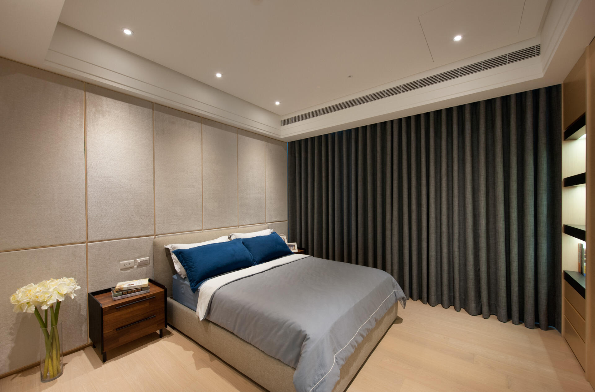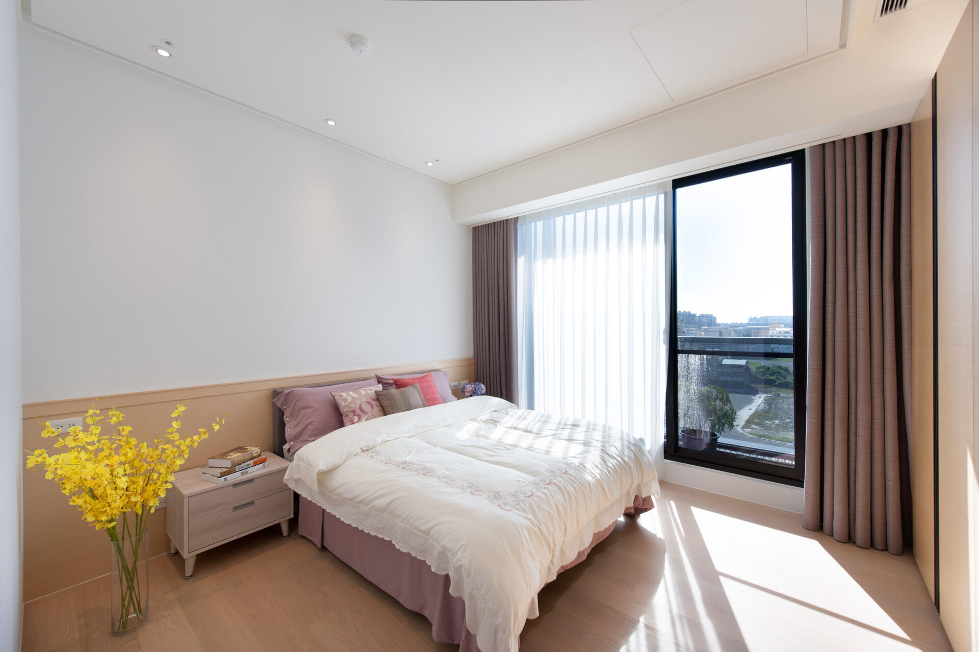 臥室區延續設計主軸,以明亮淺色調呈現空間,床頭運用繃布、簡約壁布等不同材質的變化妝點出空間的細緻感,一筆勾出流暢和諧光景,營塑出耐人尋味的雅緻氛圍。