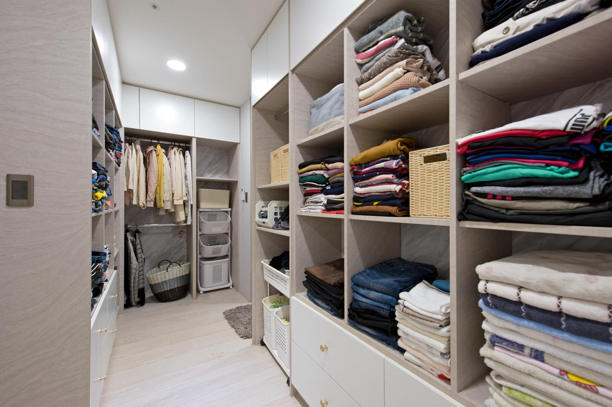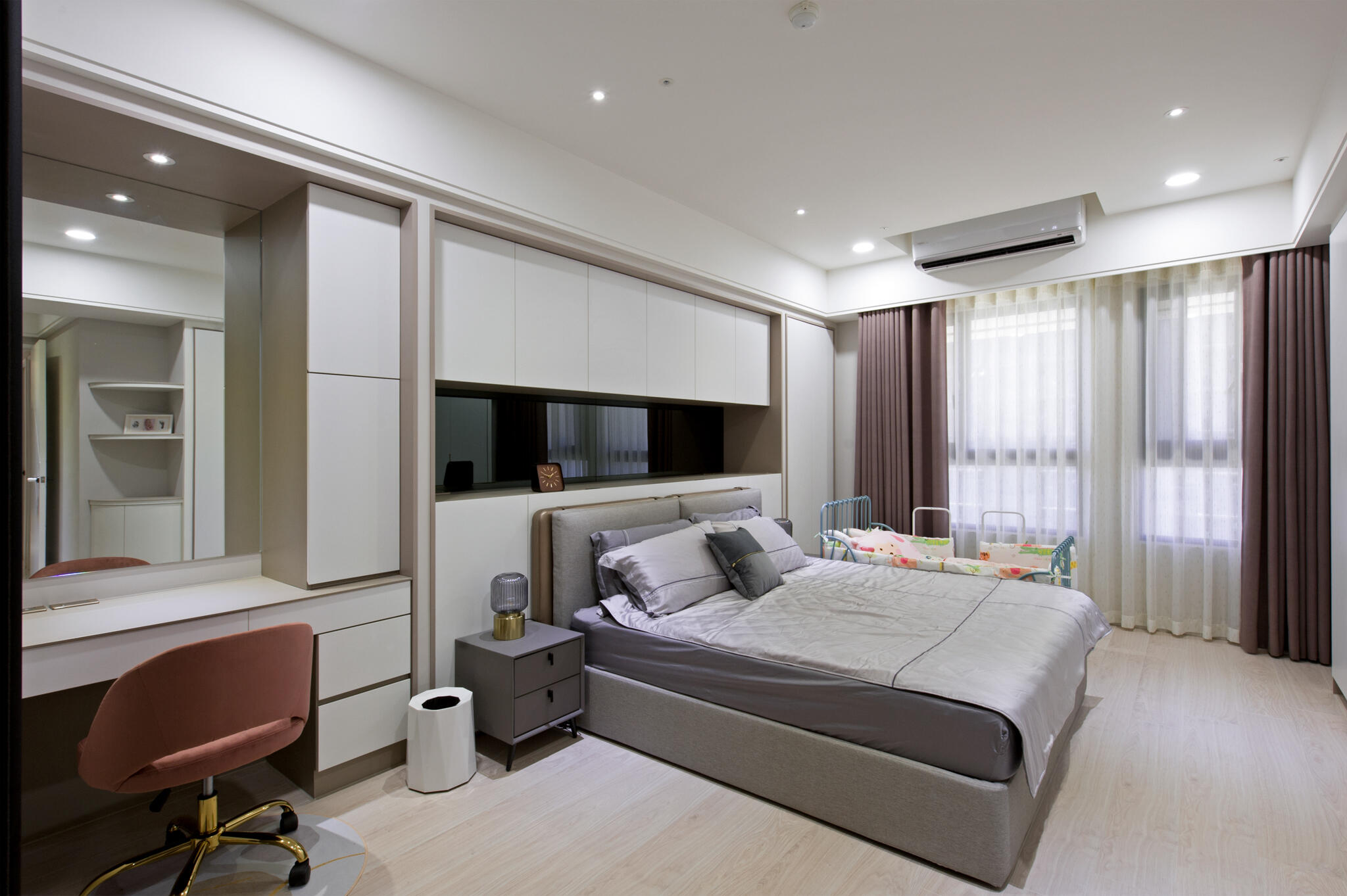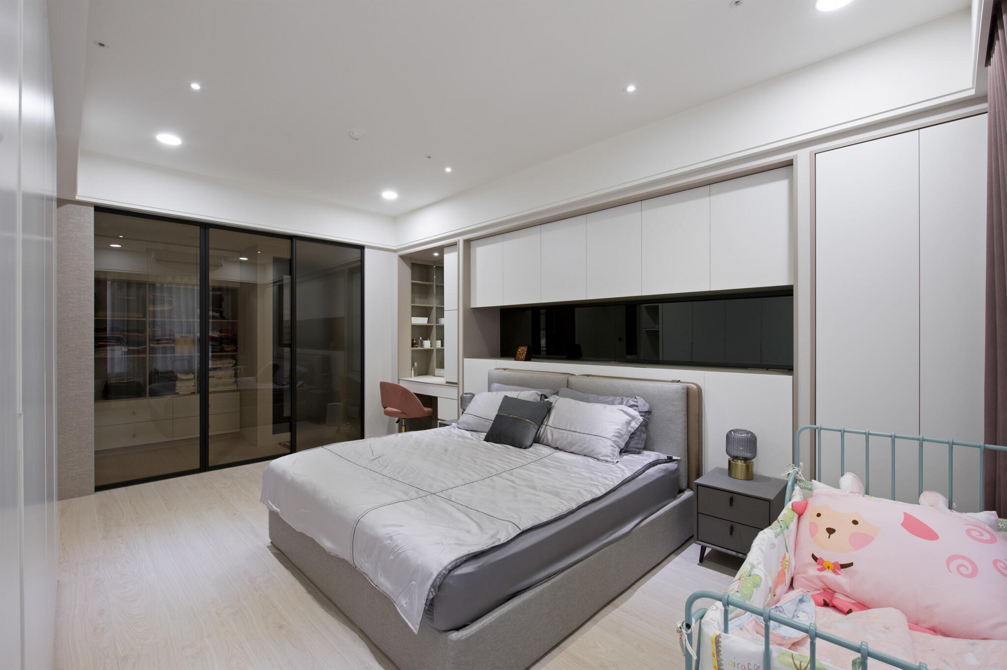 而風格上,公共空間以輕柔精緻為基調設計,整體空間視覺透露剛柔並濟的美感。客廳電視牆的溫潤色調,平衡建材的冷冽感,把公領域的奢華氣息堆疊得恰到好處。私領域則以微霧光澤,區隔公領域的亮面張揚,巧妙轉換恬靜、擁有舒適放鬆氛圍。