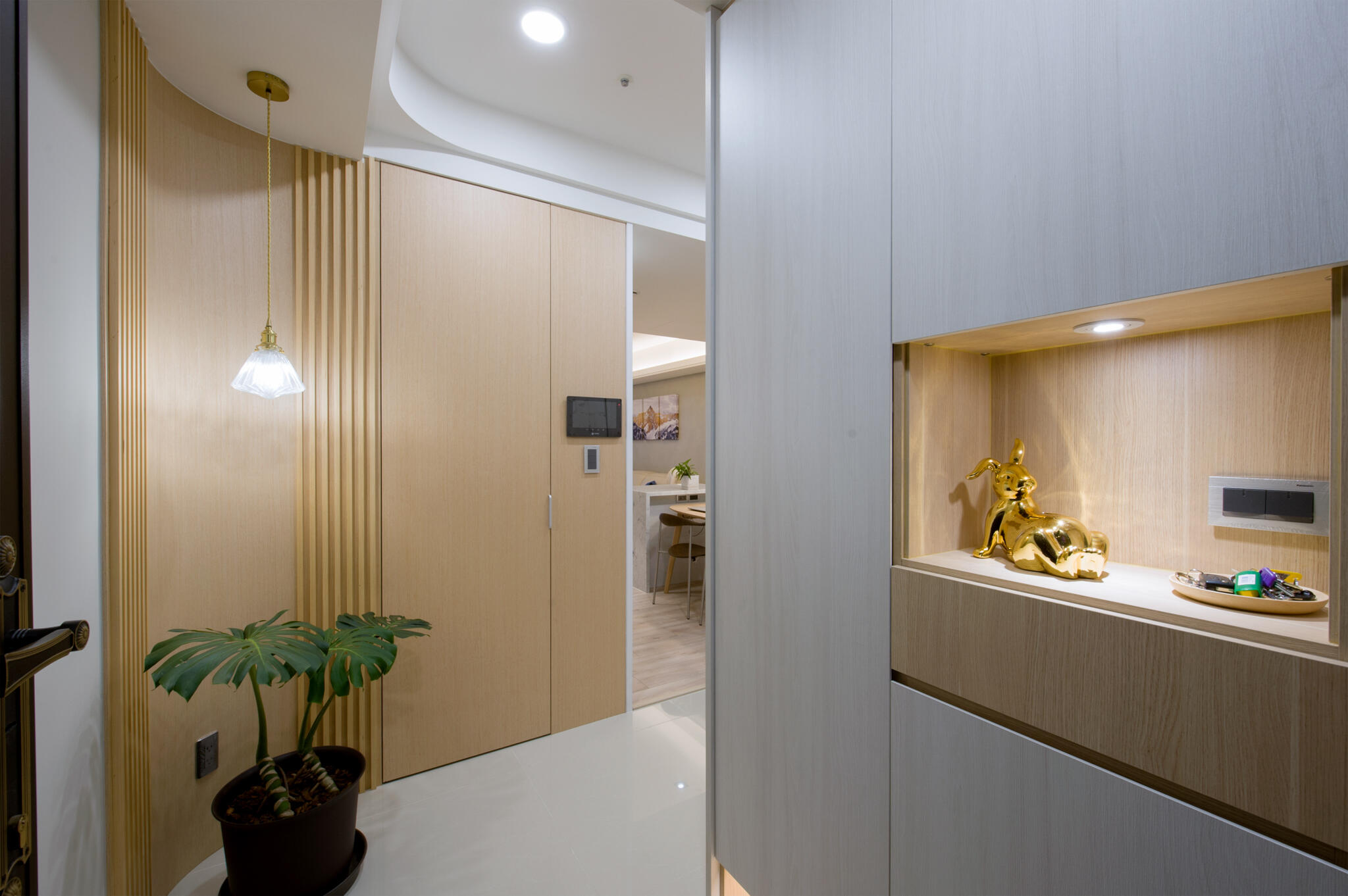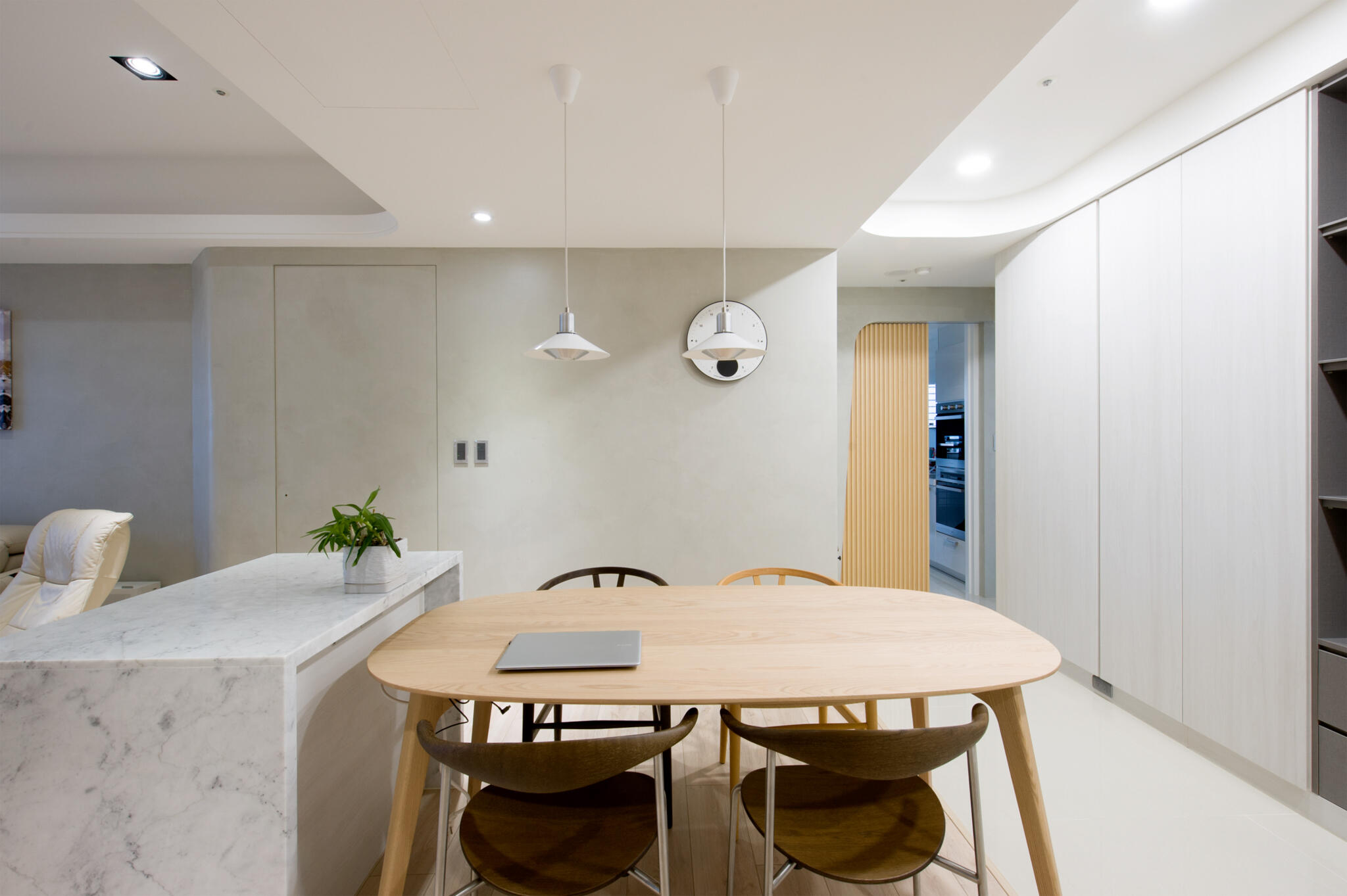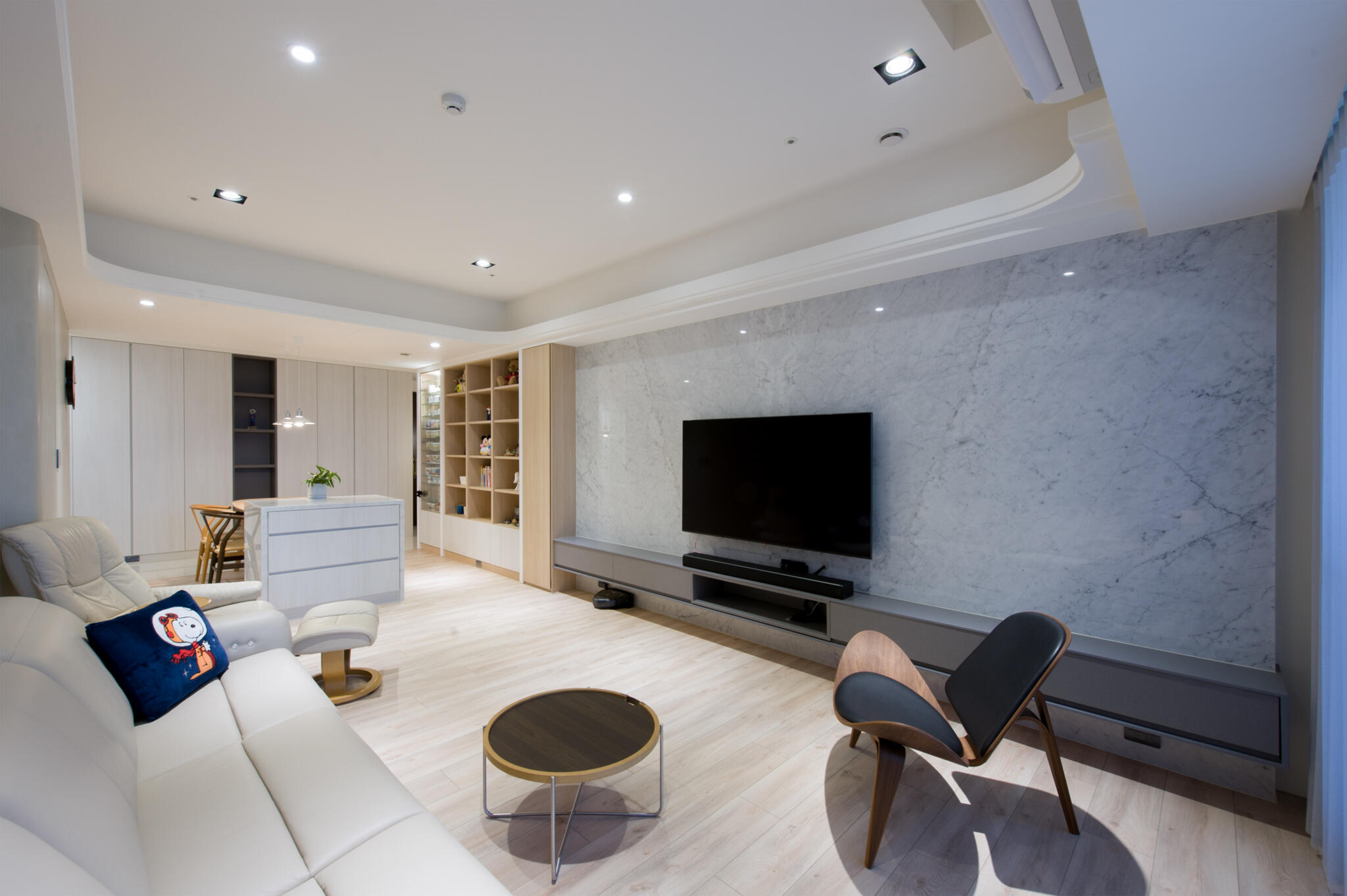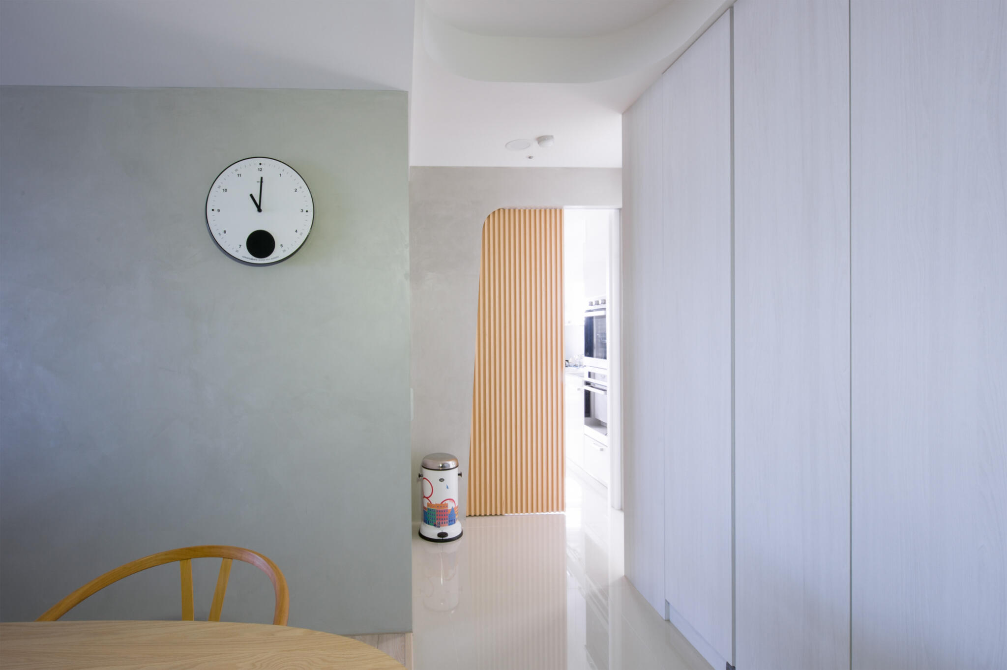 為了舒緩空間感,僅修改了主臥室開門的位置,不只延伸了餐廳的空間,一併在房子的中央新增儲藏室,在收納上做更靈活的運用,而希望可以呈現一種輕盈、清透,室內於是規避僵硬直角,運用了許多圓弧造型,消弭了鋒利銳角也能在感官上多了柔和映像。