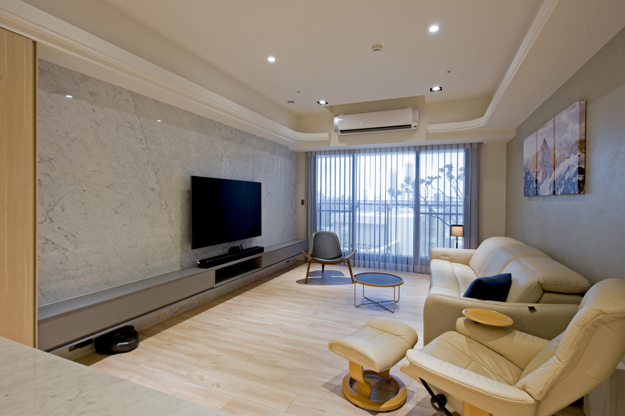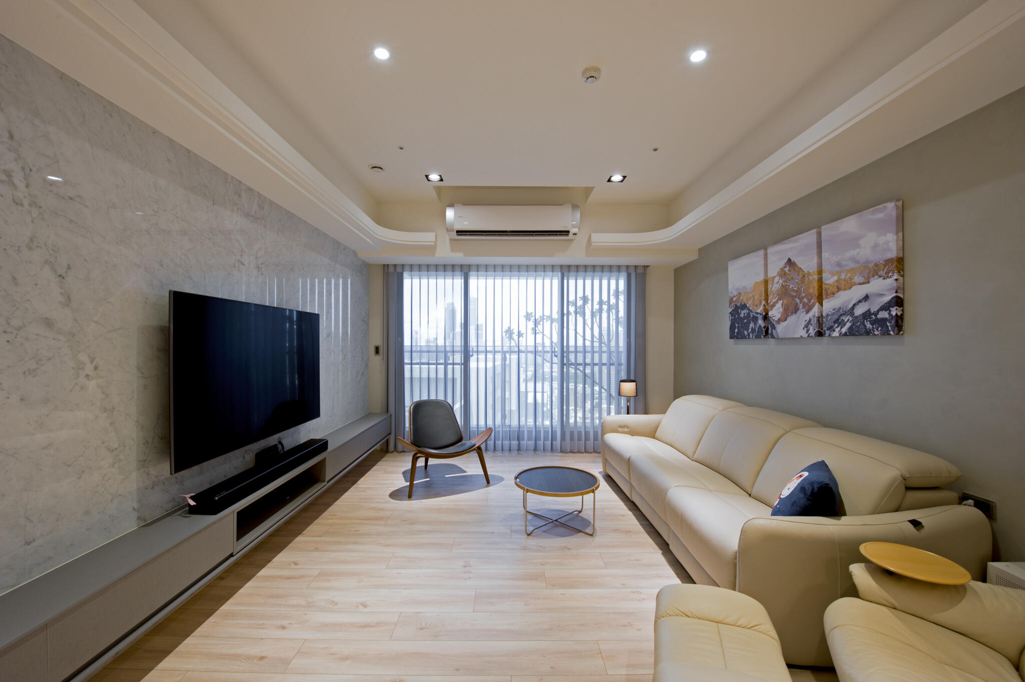 藉由引光入室,步履其間浸潤在溫柔的日光下,以白與灰的中性調為基礎,溫潤原木堆砌層次,藉著和諧視覺襯托窗景,指引出家的方向。