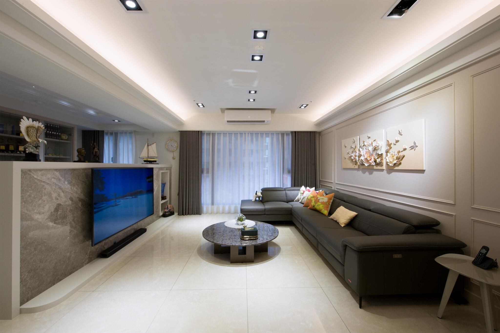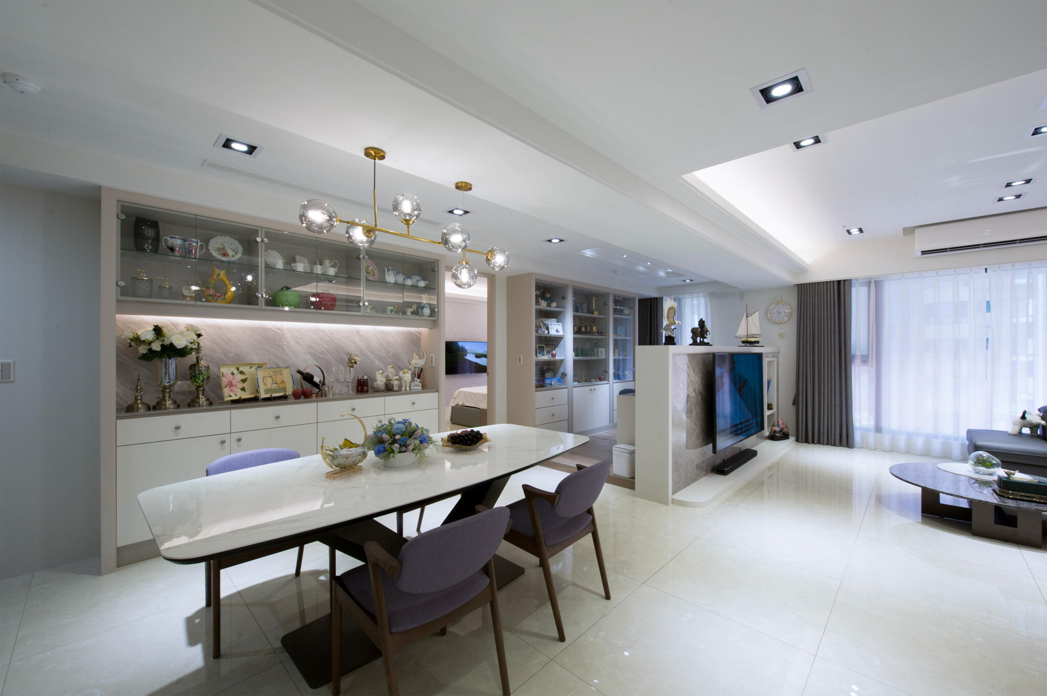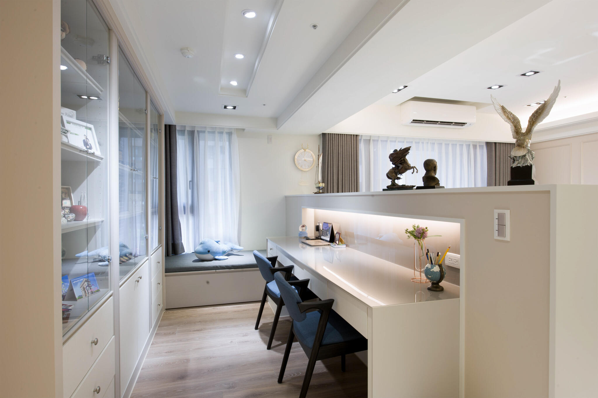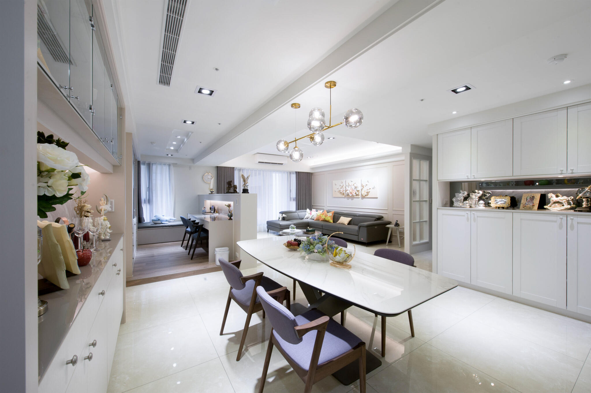 跳脫過去的大量裝飾線條的古典裝潢,改以清新雅緻的新古典為空間主調,全室鋪敘白與米色的淡雅色系,在大面採光映襯下,更顯敞亮大氣。設計手法上,天花板的層次與各式的收納櫃體,皆運用俐落的線條鋪排,演繹新古典美學。而開放的公領域,不僅有軒敞的客廳,特意規劃的書房融入其中,輔以餐廳,流暢的生活動線與實用機能,讓屋主一家能自在細細品味每天的生活點滴。