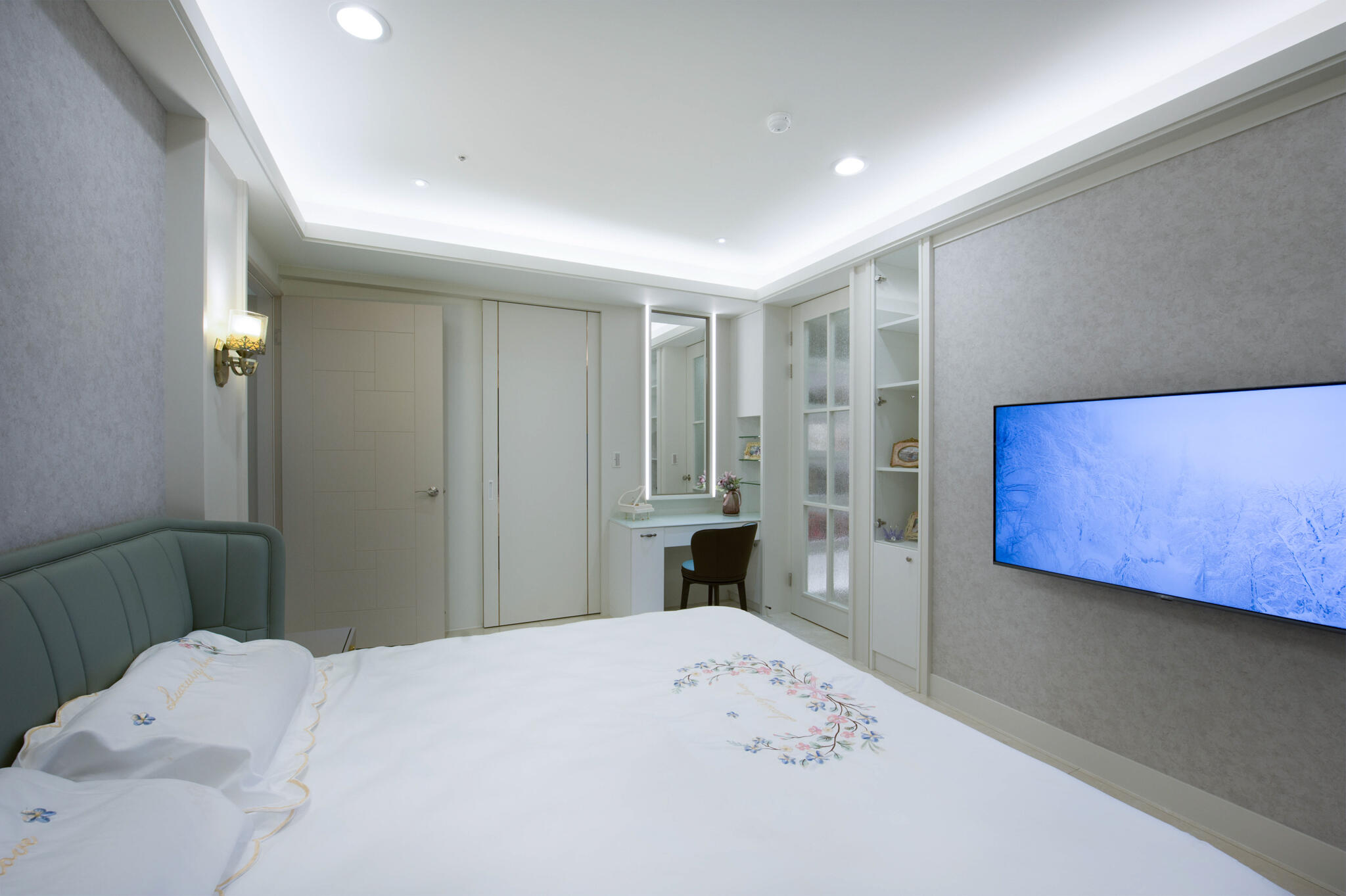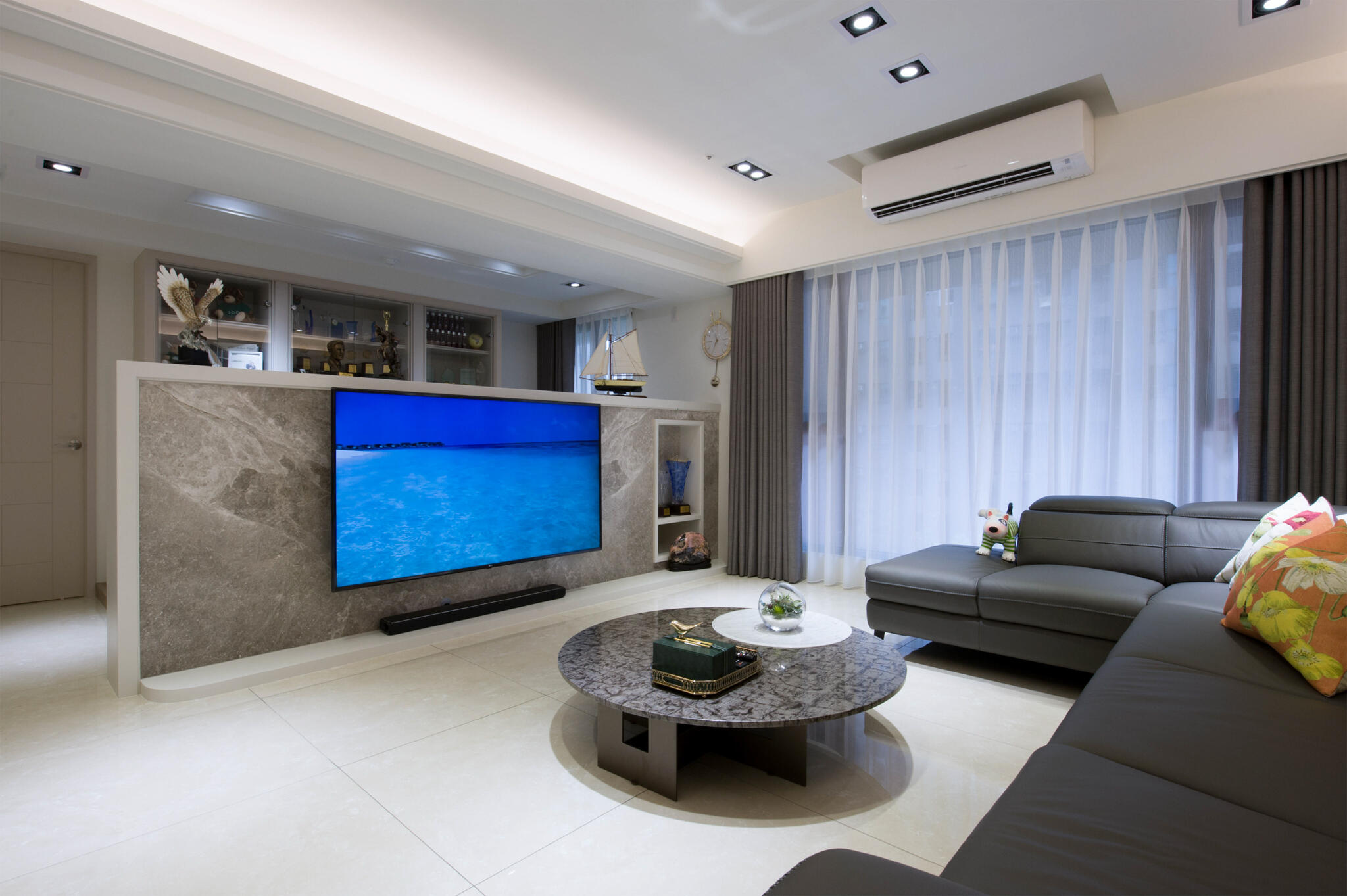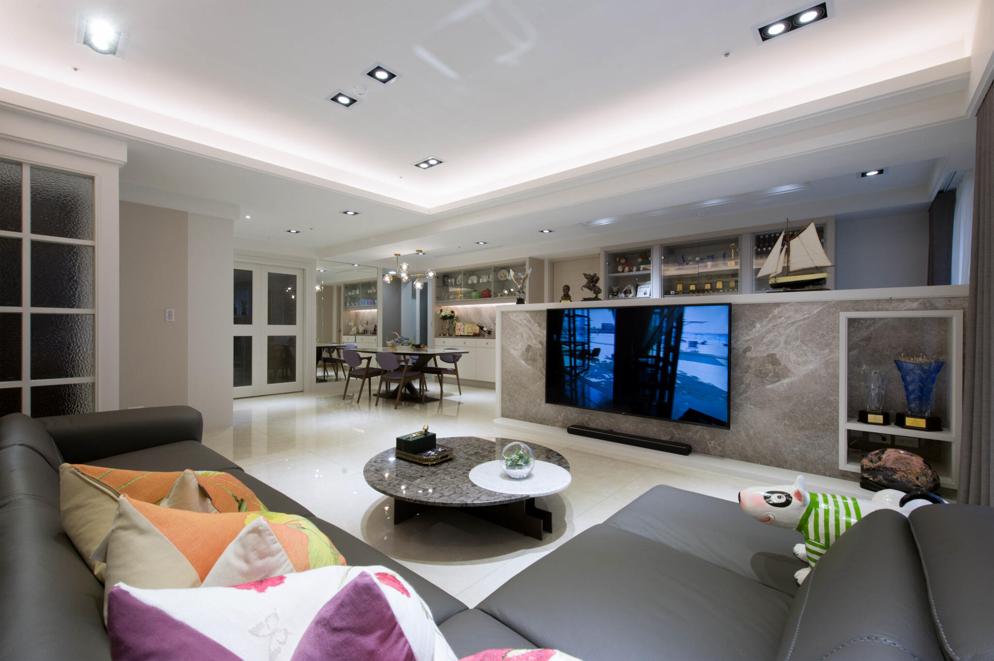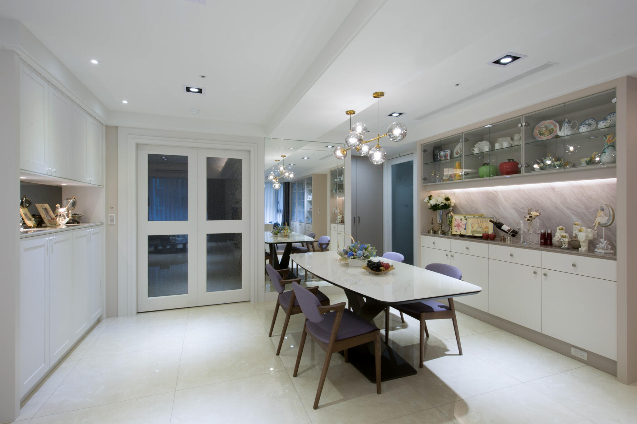 跳脫過去的大量裝飾線條的古典裝潢,改以清新雅緻的新古典為空間主調,全室鋪敘白與米色的淡雅色系,在大面採光映襯下,更顯敞亮大氣。設計手法上,天花板的層次與各式的收納櫃體,皆運用俐落的線條鋪排,演繹新古典美學。而開放的公領域,不僅有軒敞的客廳,特意規劃的書房融入其中,輔以餐廳,流暢的生活動線與實用機能,讓屋主一家能自在細細品味每天的生活點滴。