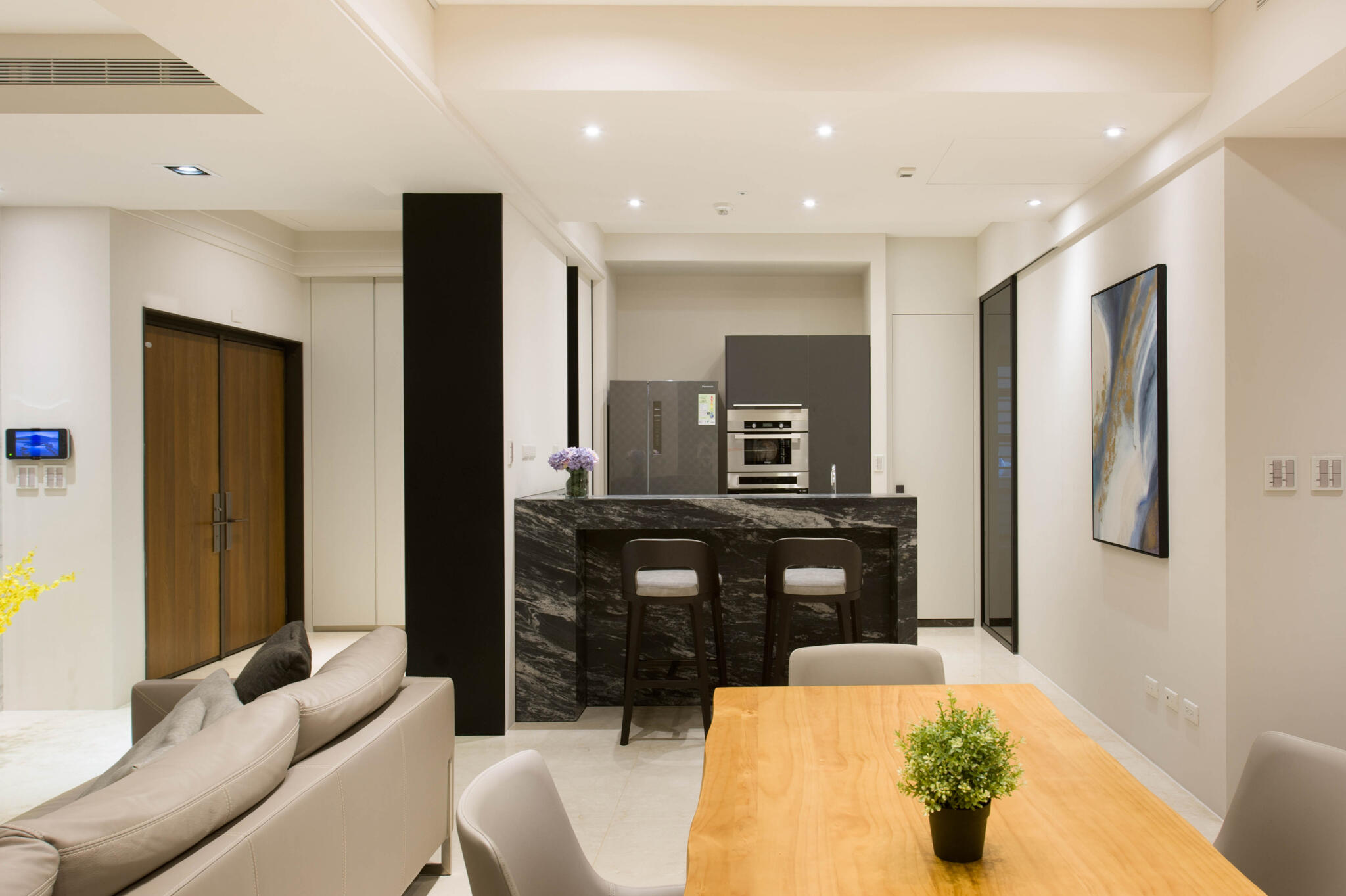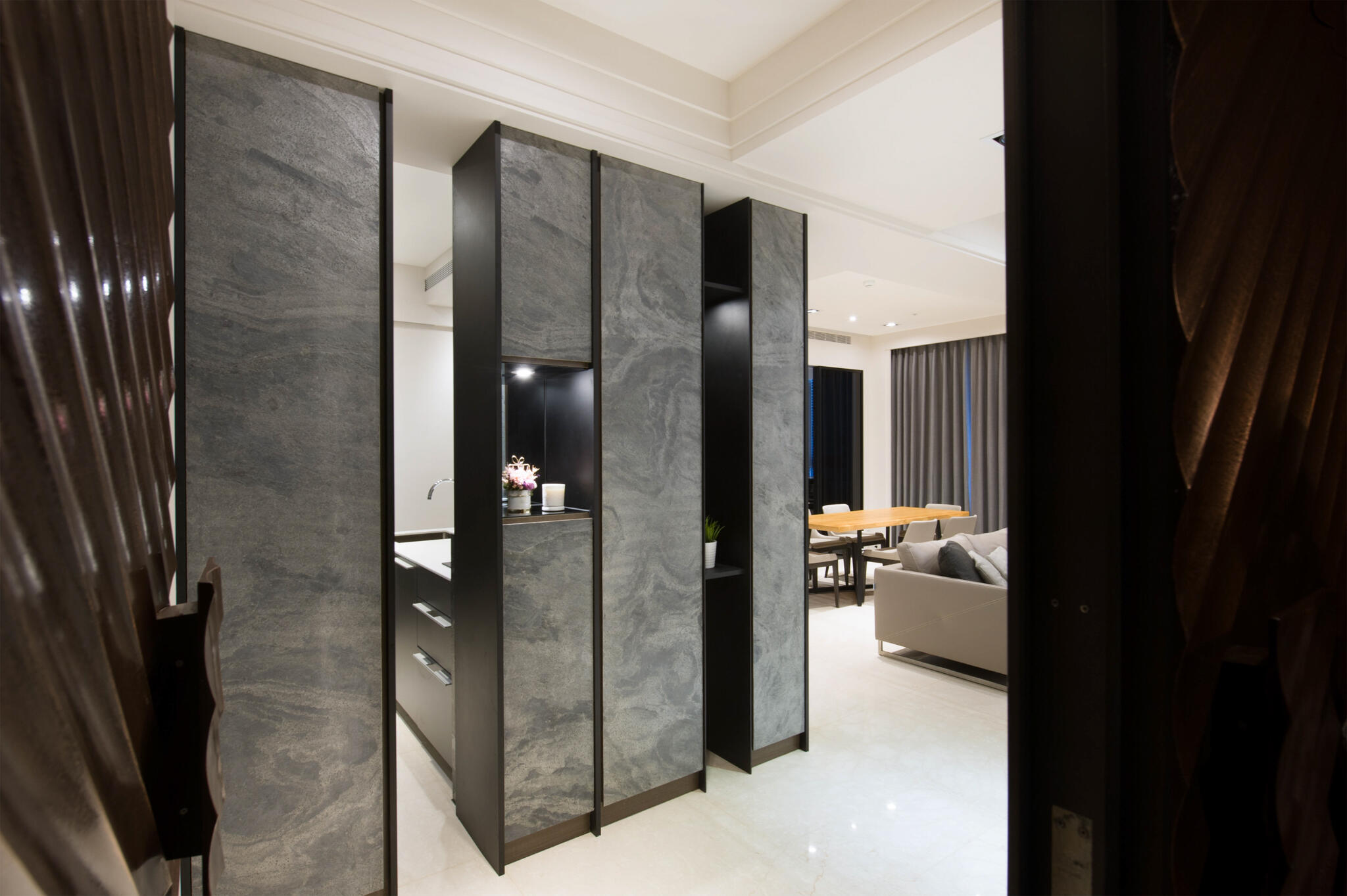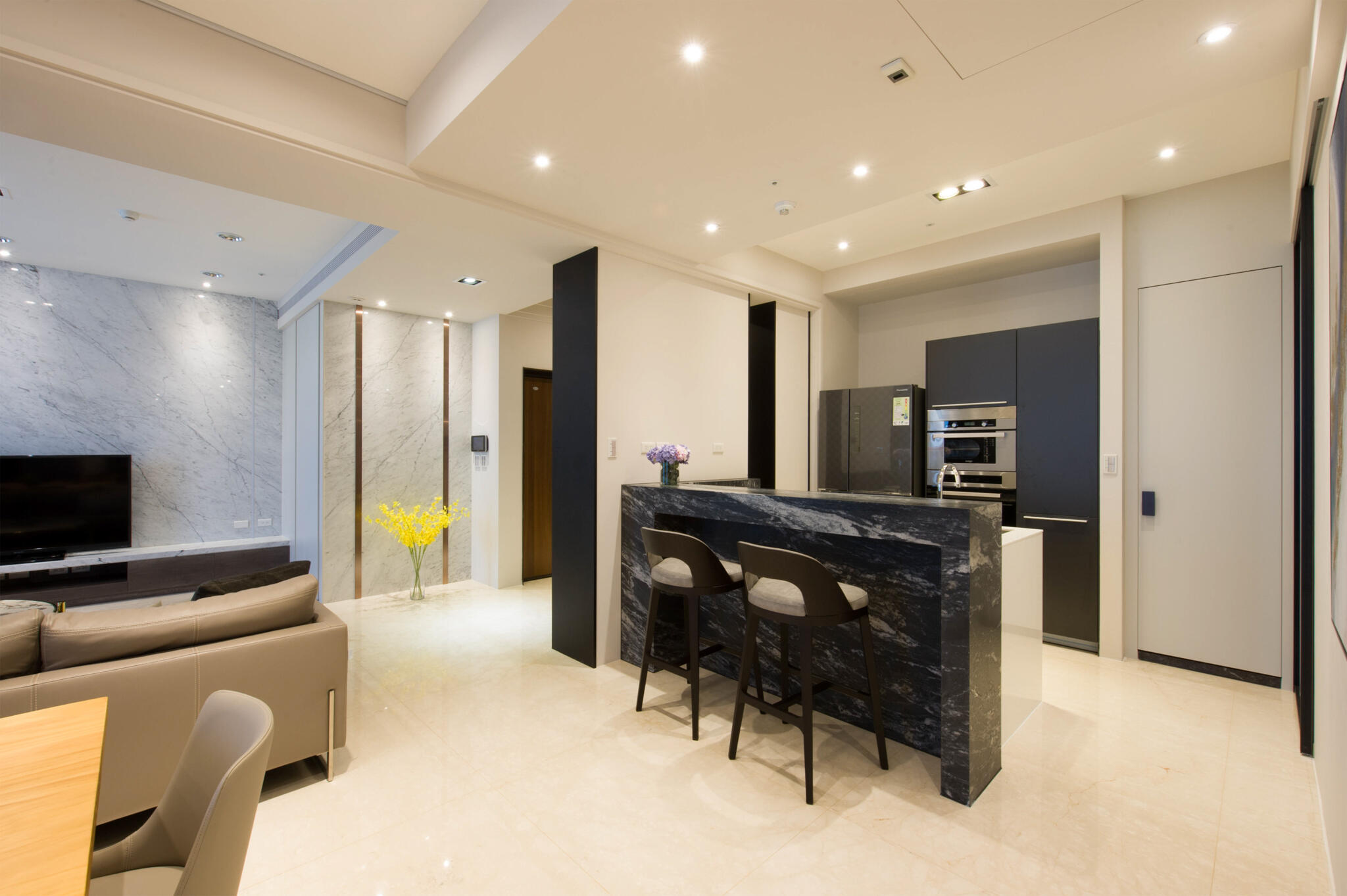 現代設計語彙圍塑出簡約空間主調,並以流暢的生活動線,打造最貼合人心的居家場景。由客廳主牆為中心,延伸挑選3款不同紋理的石材,分散在玄關、公領域牆面、中島檯面,各有嬌嬈姿態又能相互融合,同時闡述以石材紋理與金屬感交織的設計主軸,點亮了空間中截然不同的歡快。