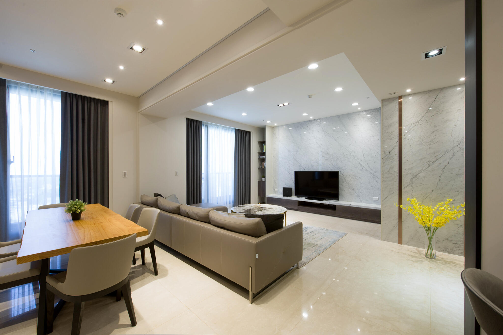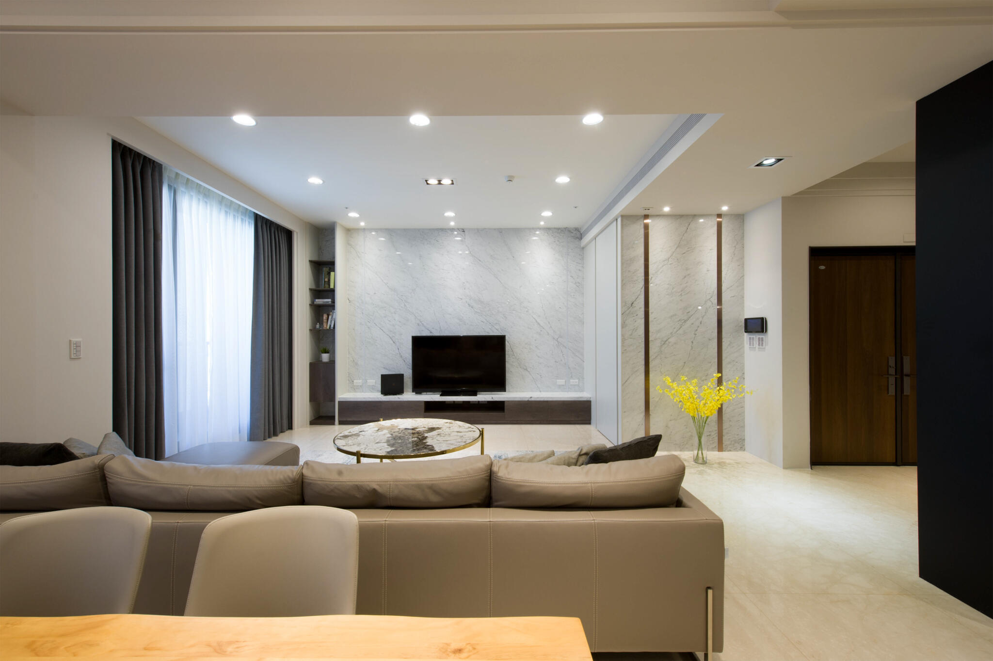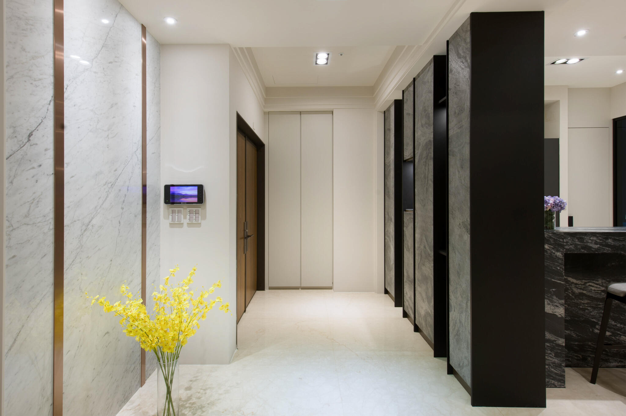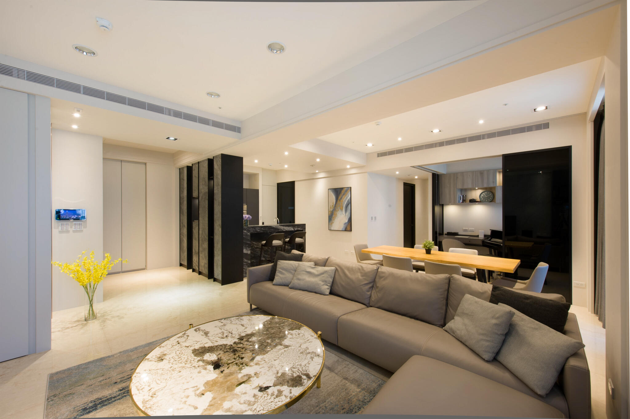 現代設計語彙圍塑出簡約空間主調,並以流暢的生活動線,打造最貼合人心的居家場景。由客廳主牆為中心,延伸挑選3款不同紋理的石材,分散在玄關、公領域牆面、中島檯面,各有嬌嬈姿態又能相互融合,同時闡述以石材紋理與金屬感交織的設計主軸,點亮了空間中截然不同的歡快。