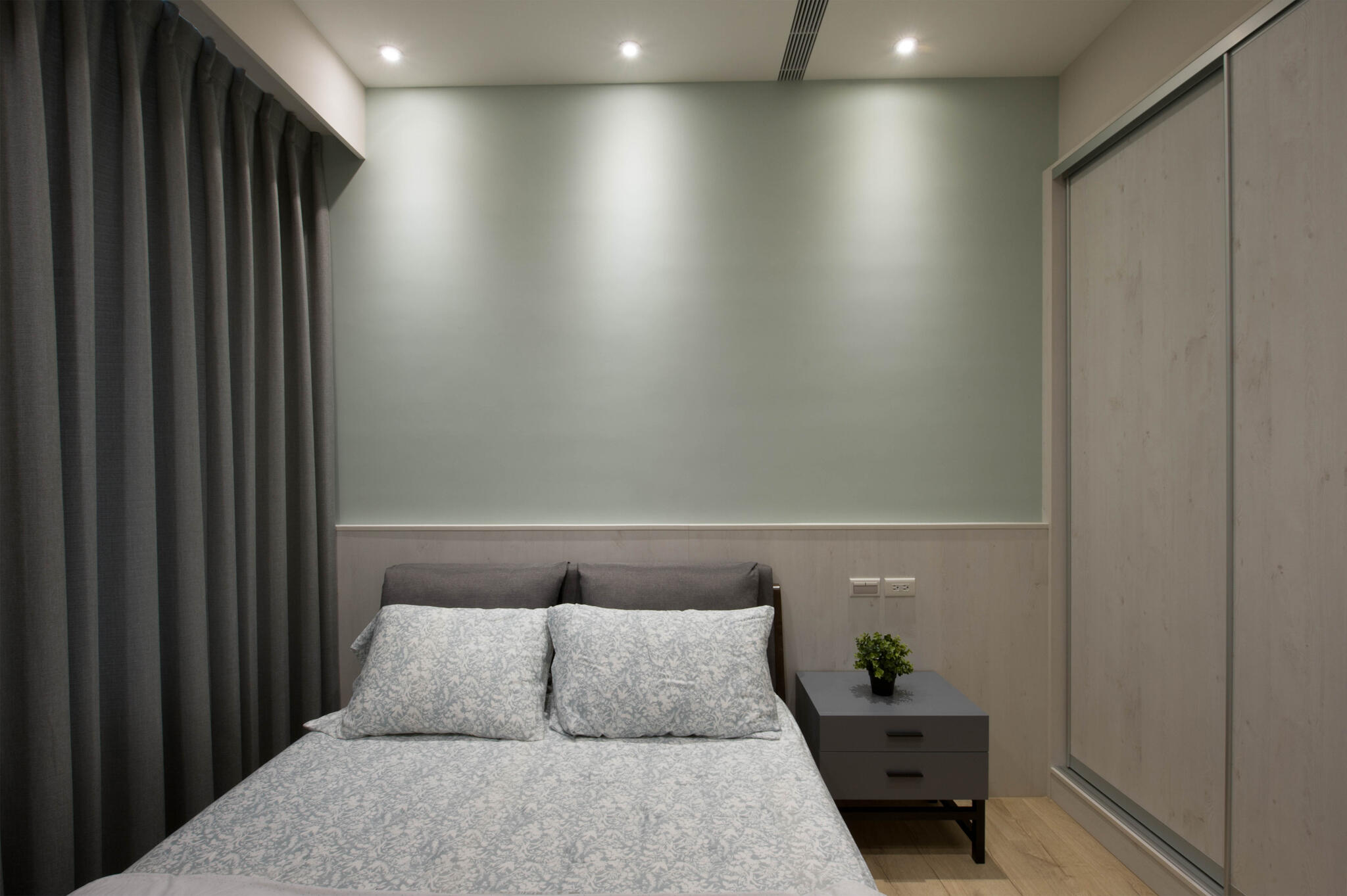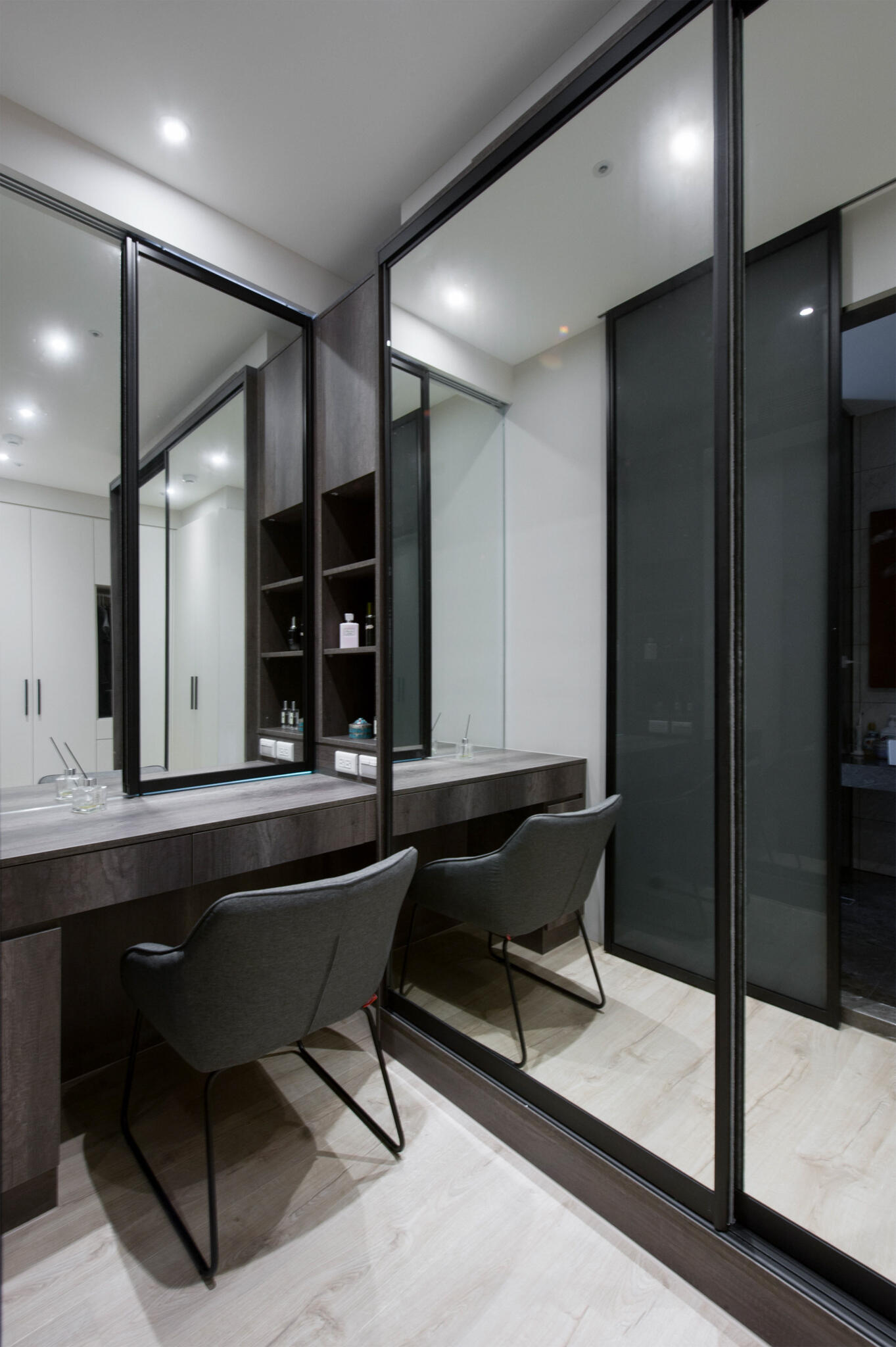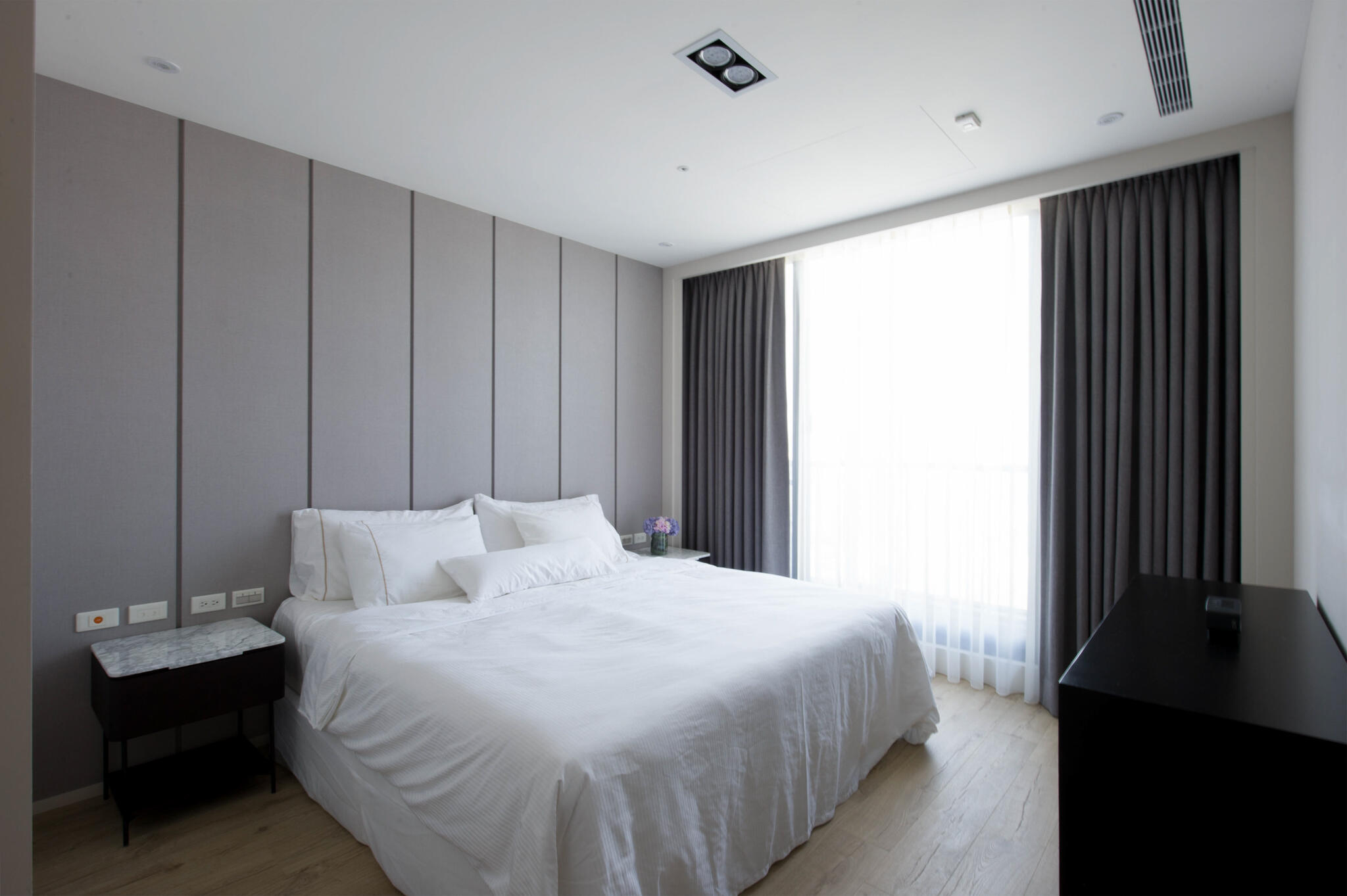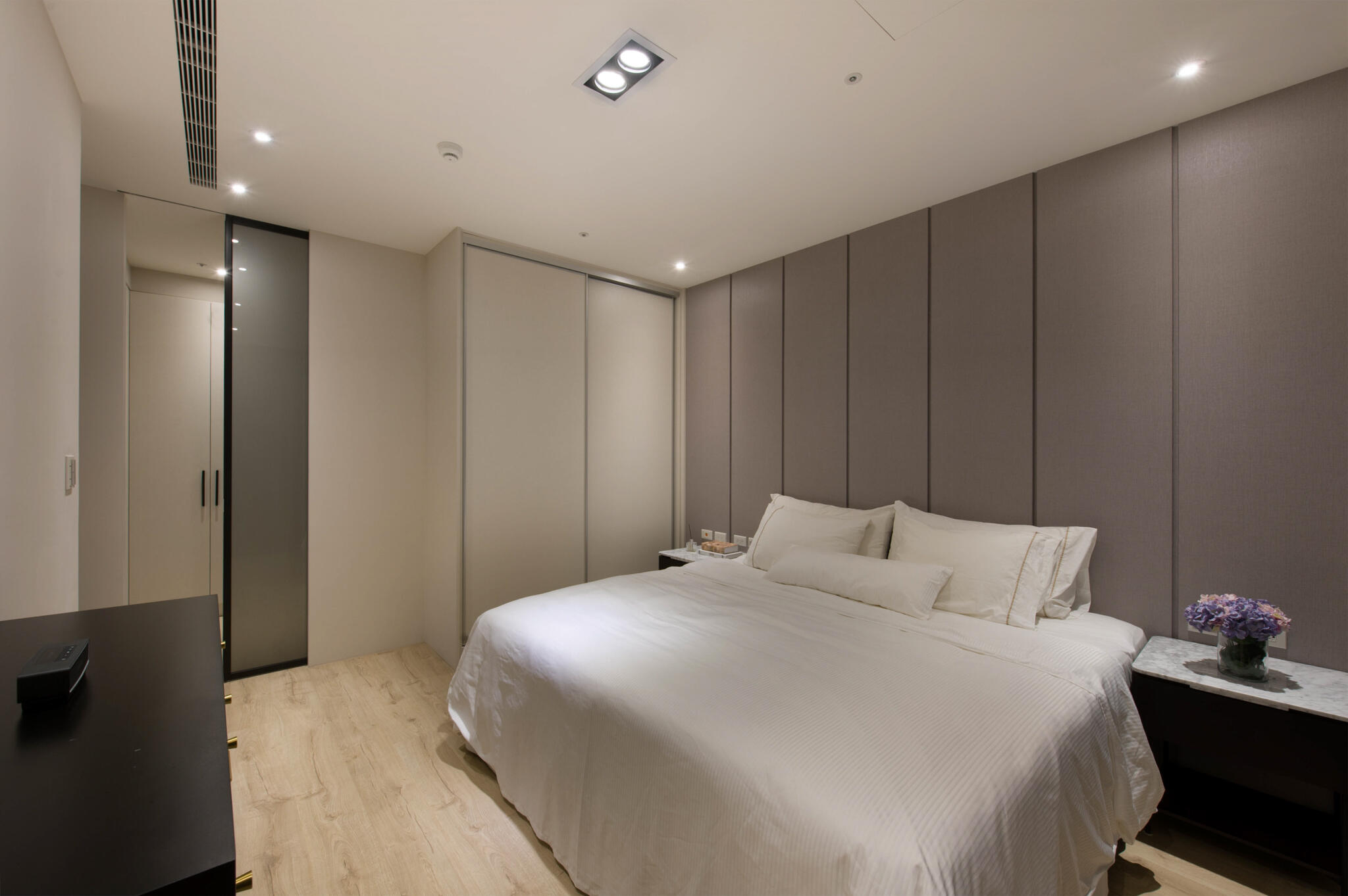 來到私領域,主臥房延續公領域主軸,線條輪廓與表現手法更趨細膩精巧,高雅、細緻質感油然而生,框構出時尚、雅緻表情,充分展現屋主對居家美學的講究。
