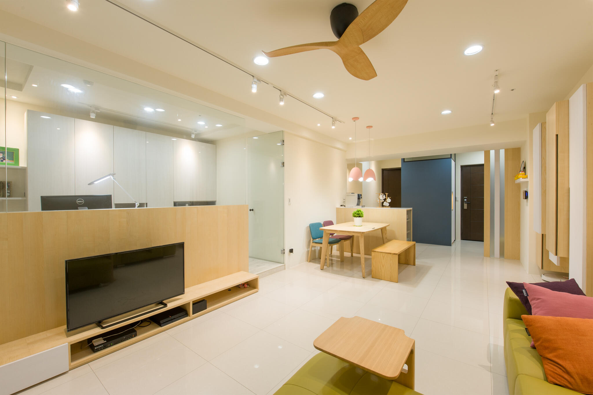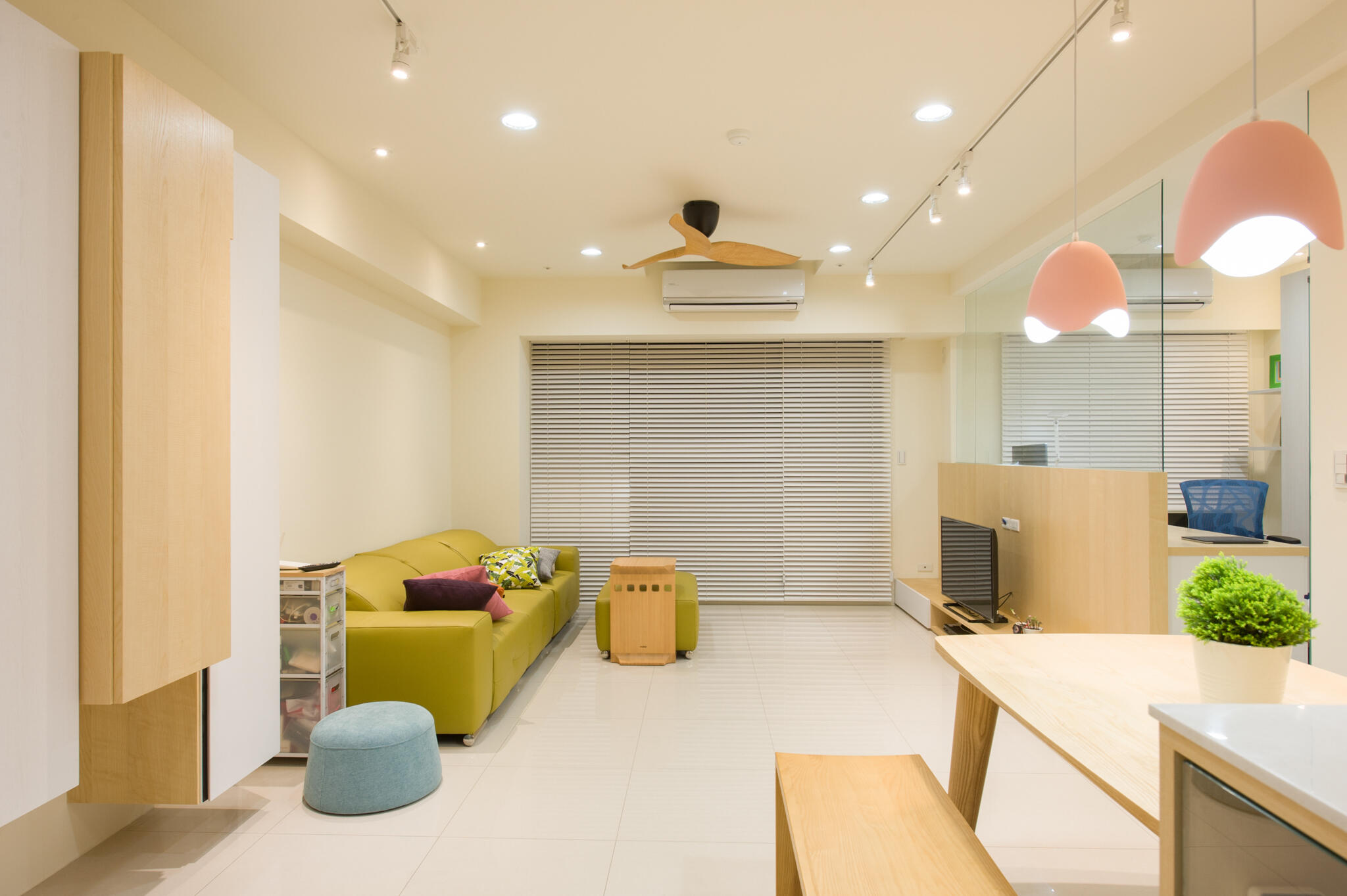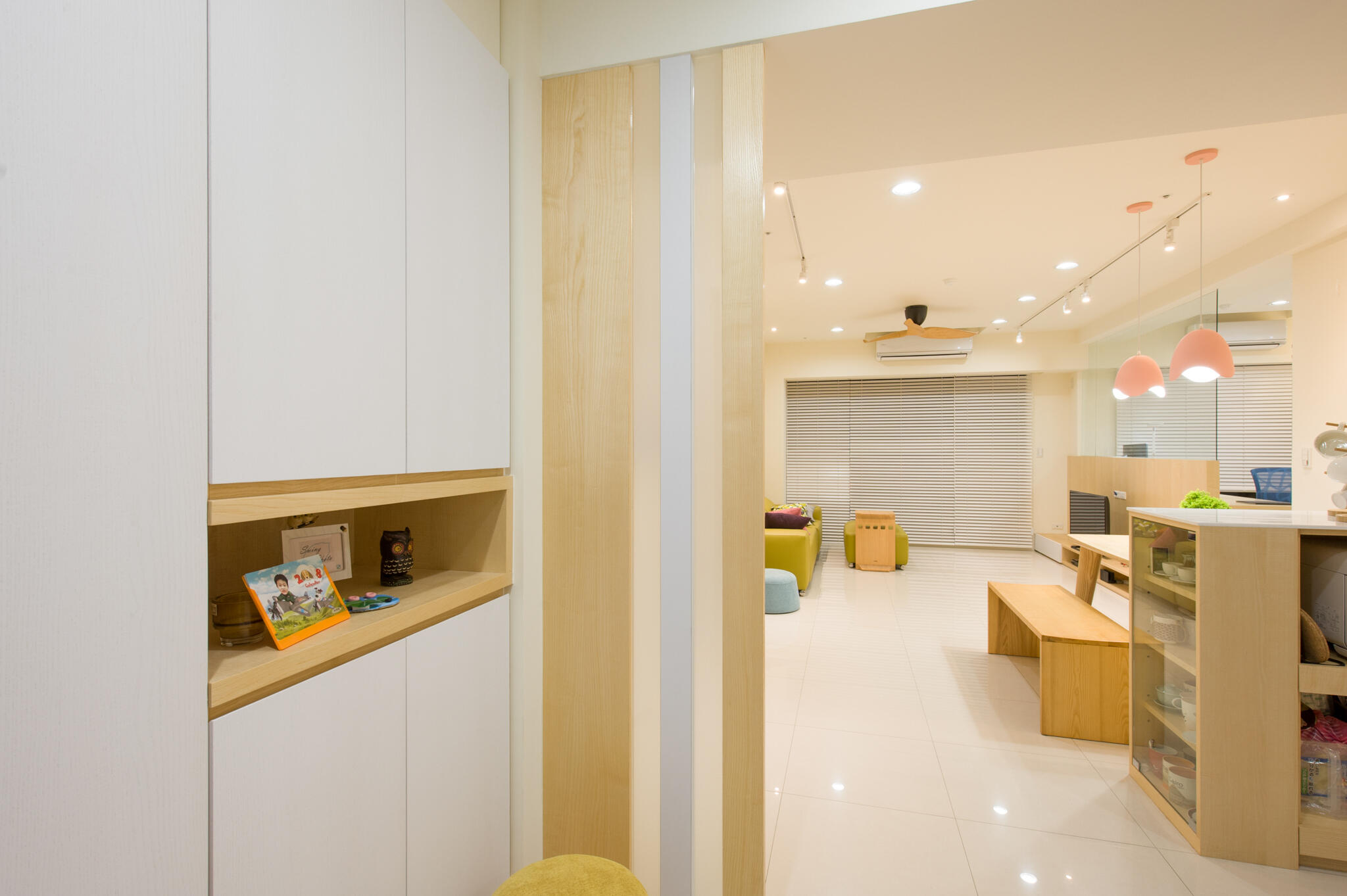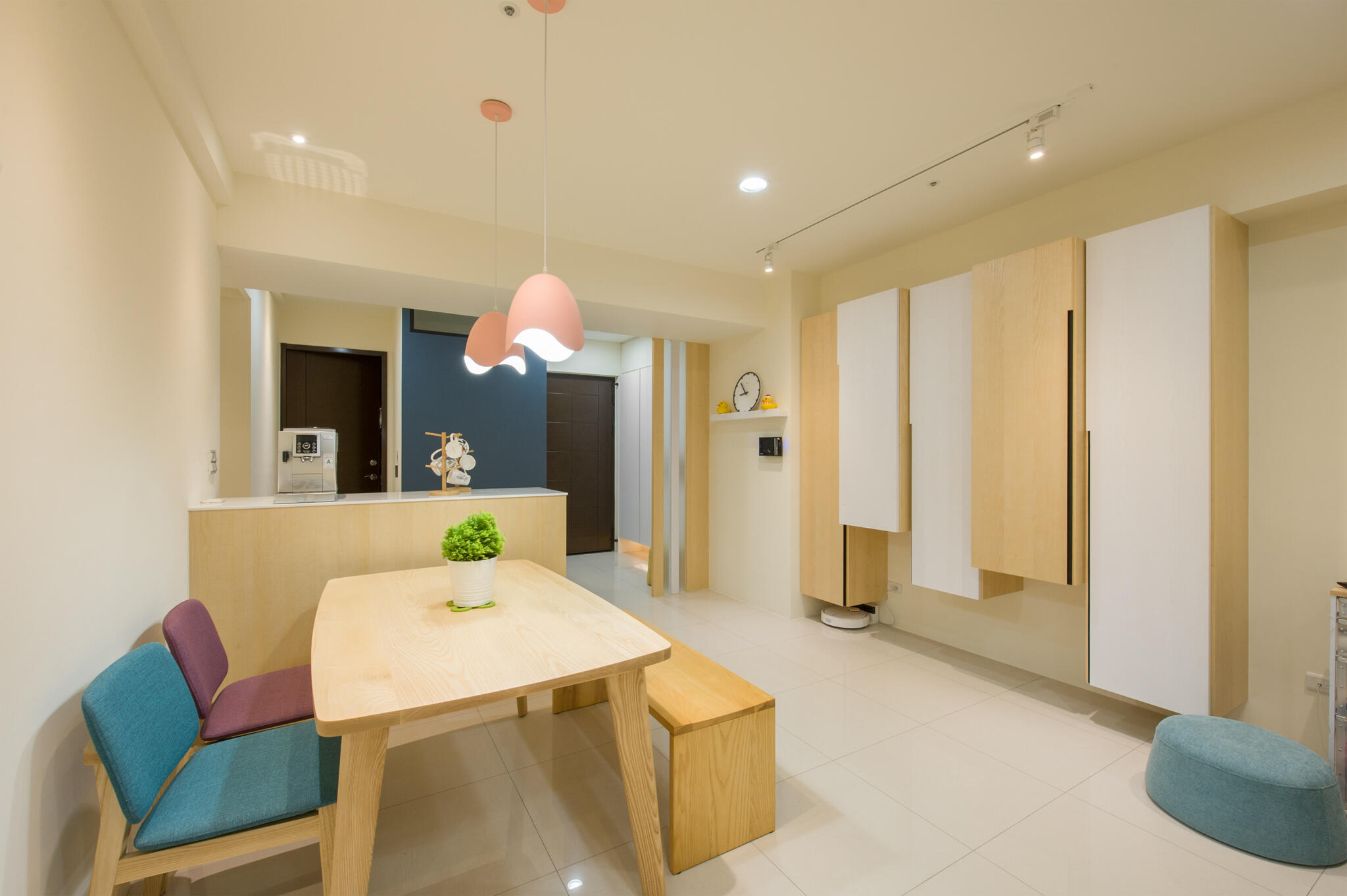 空間分配上運用富有童趣的櫃體設計來做區隔,在材質運用上大量使用淺色實木皮與低彩度繽紛色系做搭配,營造各室內空間恰如其分的存在,更添居家生活趣味。
