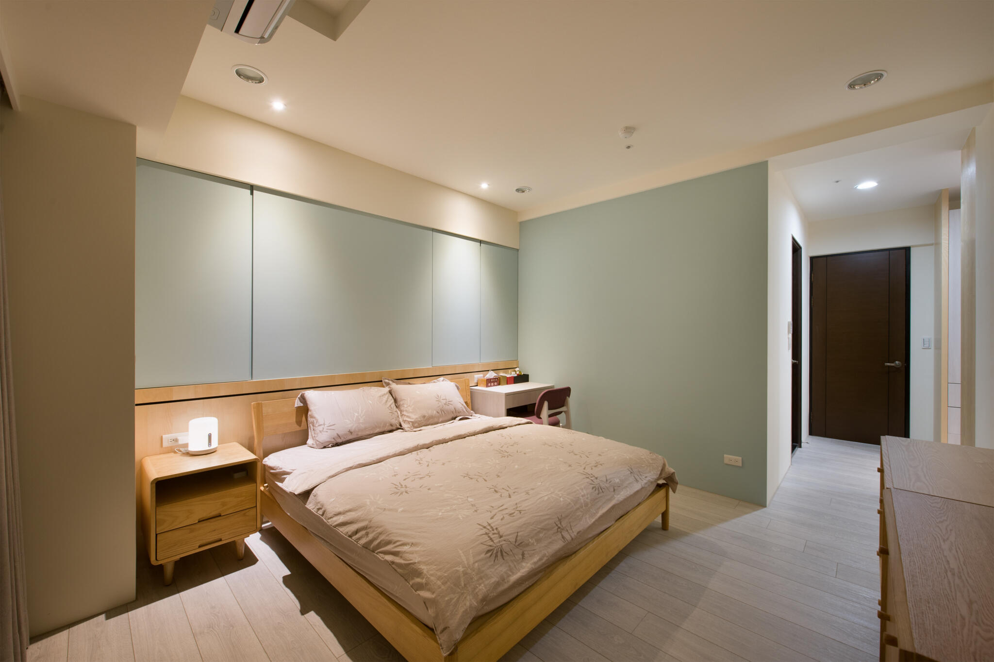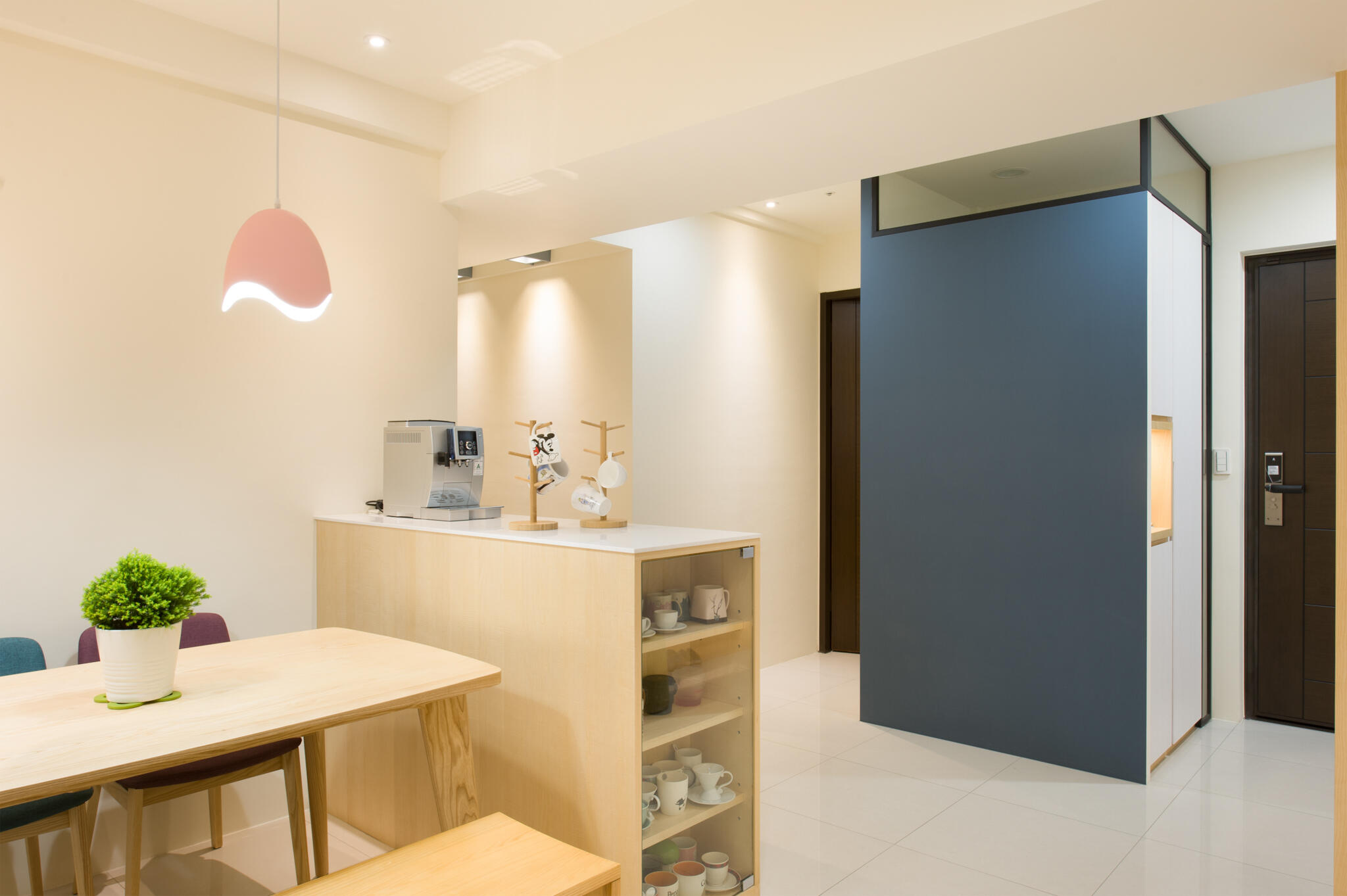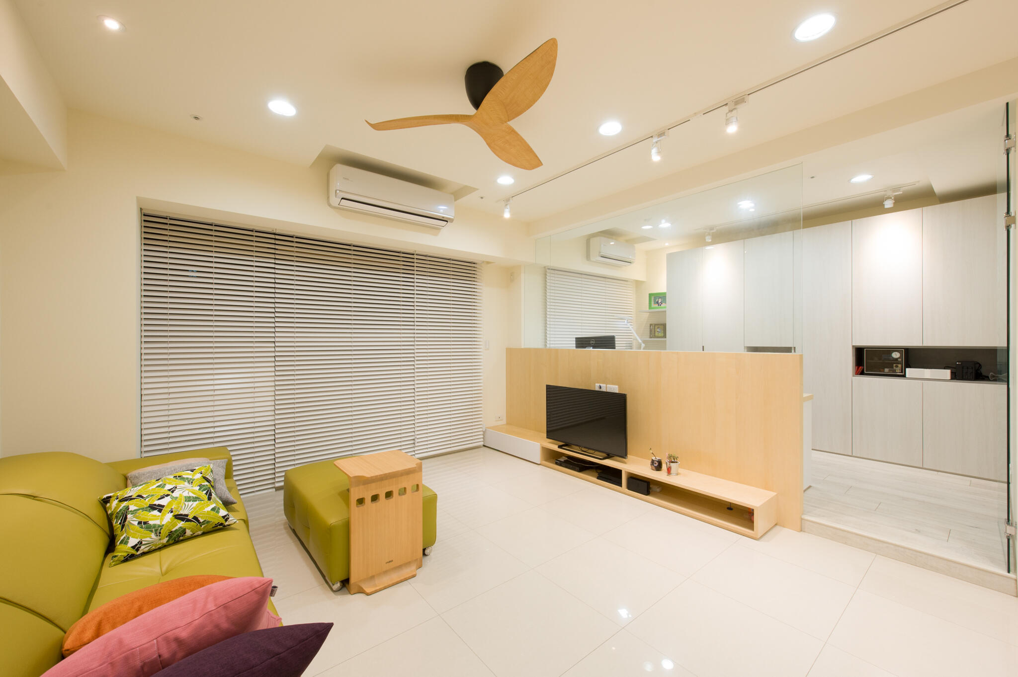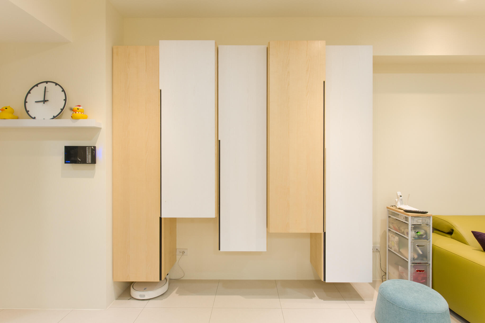 空間分配上運用富有童趣的櫃體設計來做區隔,在材質運用上大量使用淺色實木皮與低彩度繽紛色系做搭配,營造各室內空間恰如其分的存在,更添居家生活趣味。