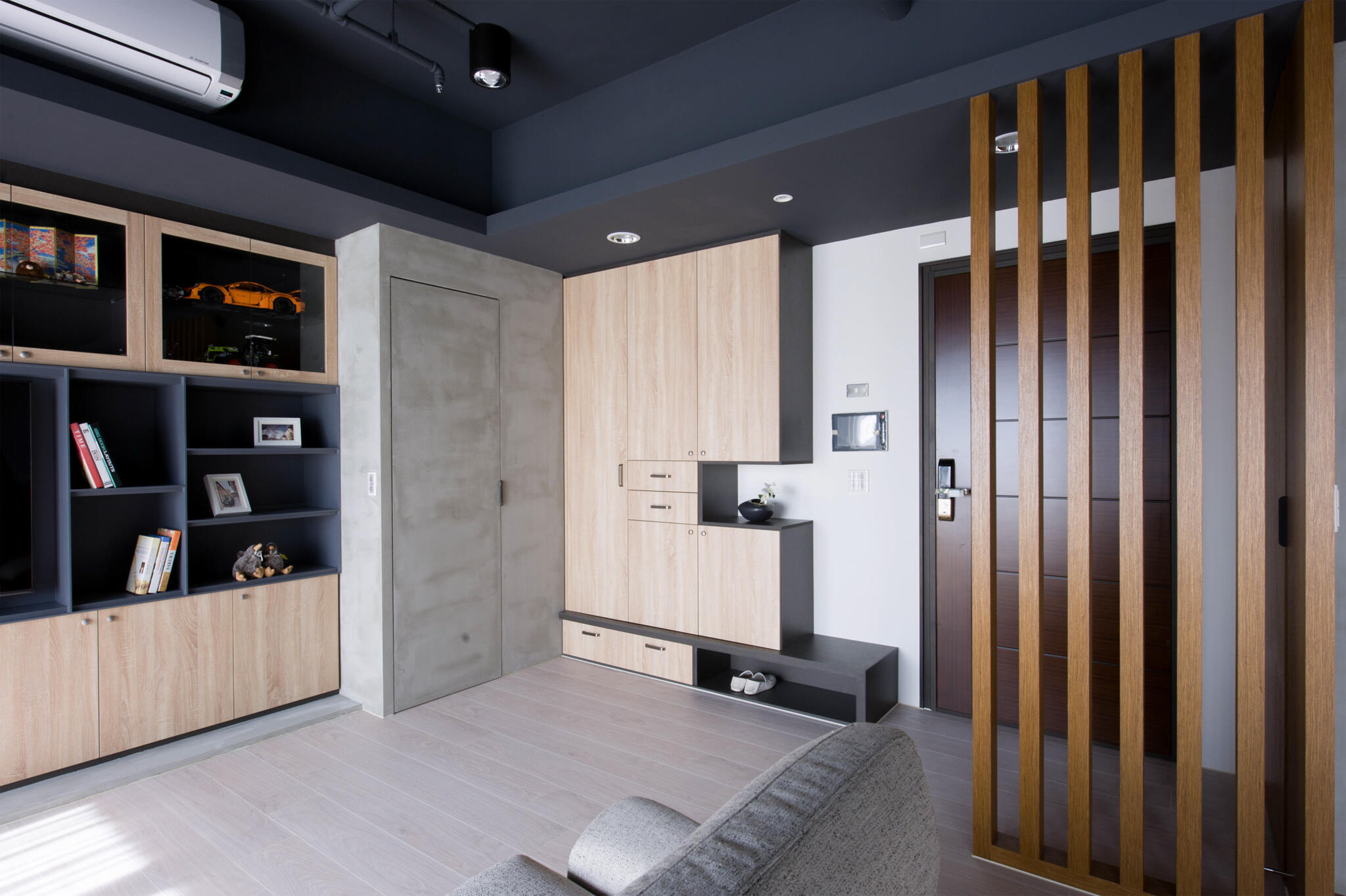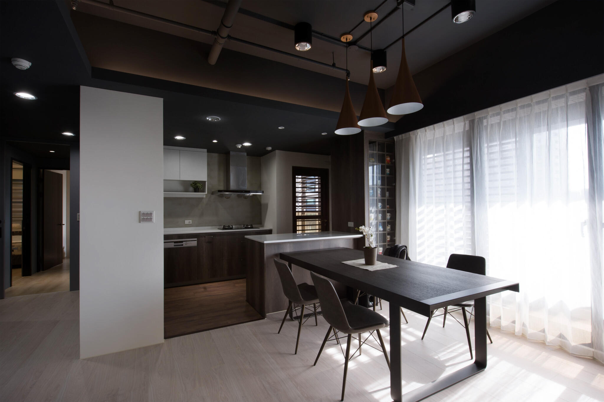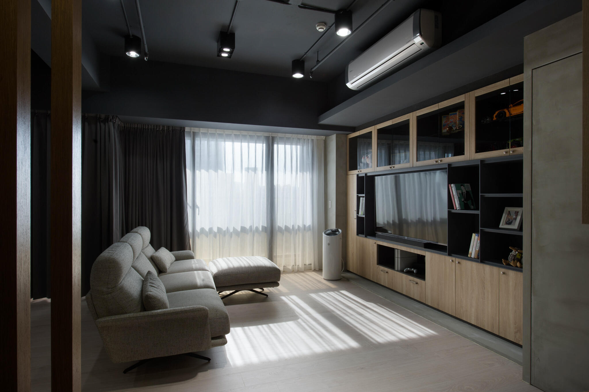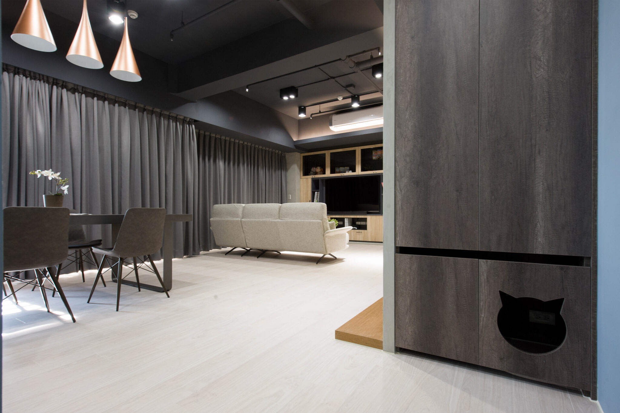 開放的公領域有著沉穩的灰色調,搭配大量的木紋材質和仿水泥的特殊漆面,營造出溫潤氛圍和沉澱紓壓感,大面採光讓窗外的景緻引入室內,讓視線更顯開放寬敞,空間加入重點式的投射光源,讓居家隨時擁有不同氣氛與表情,公、私領域以木地板作為劃分,煙燻質感的木地板,為典雅的臥室染上一抹粗獷、個性之美。