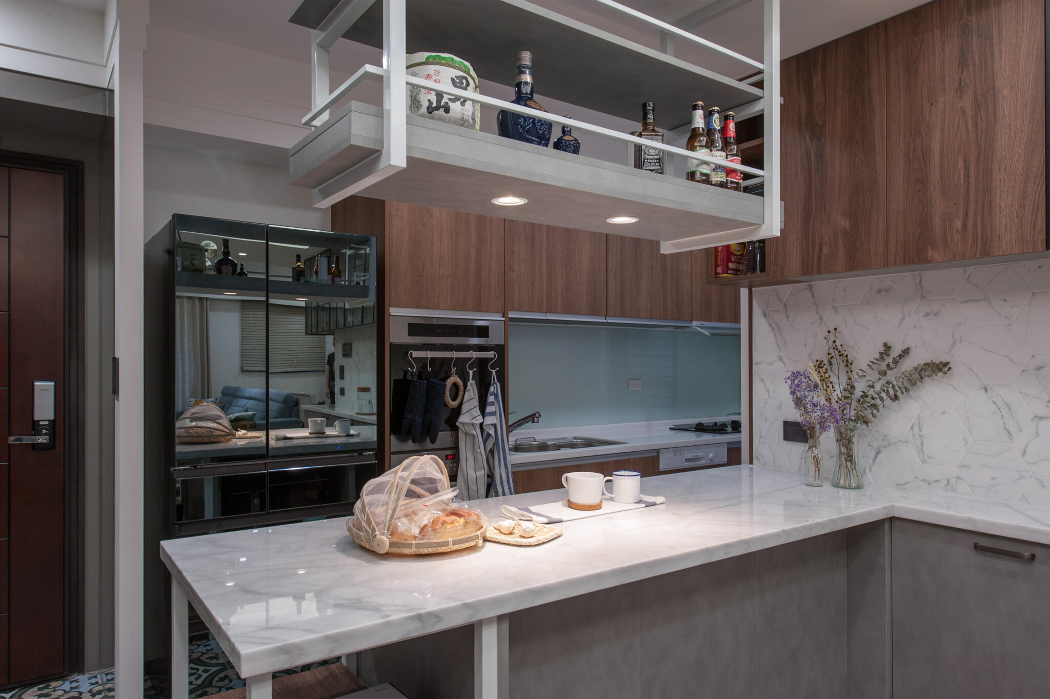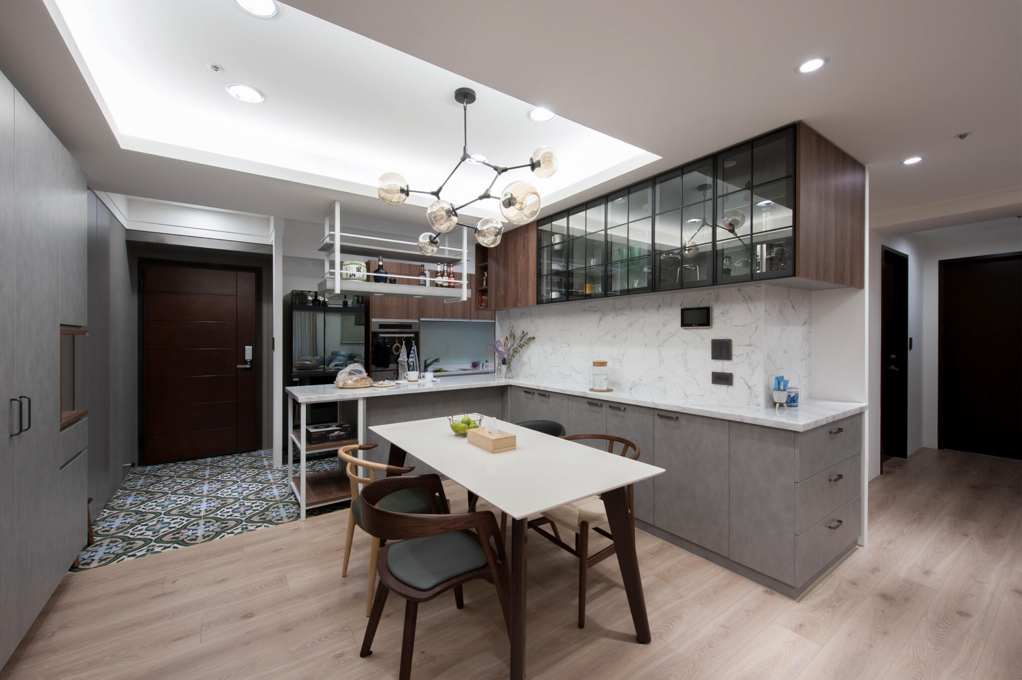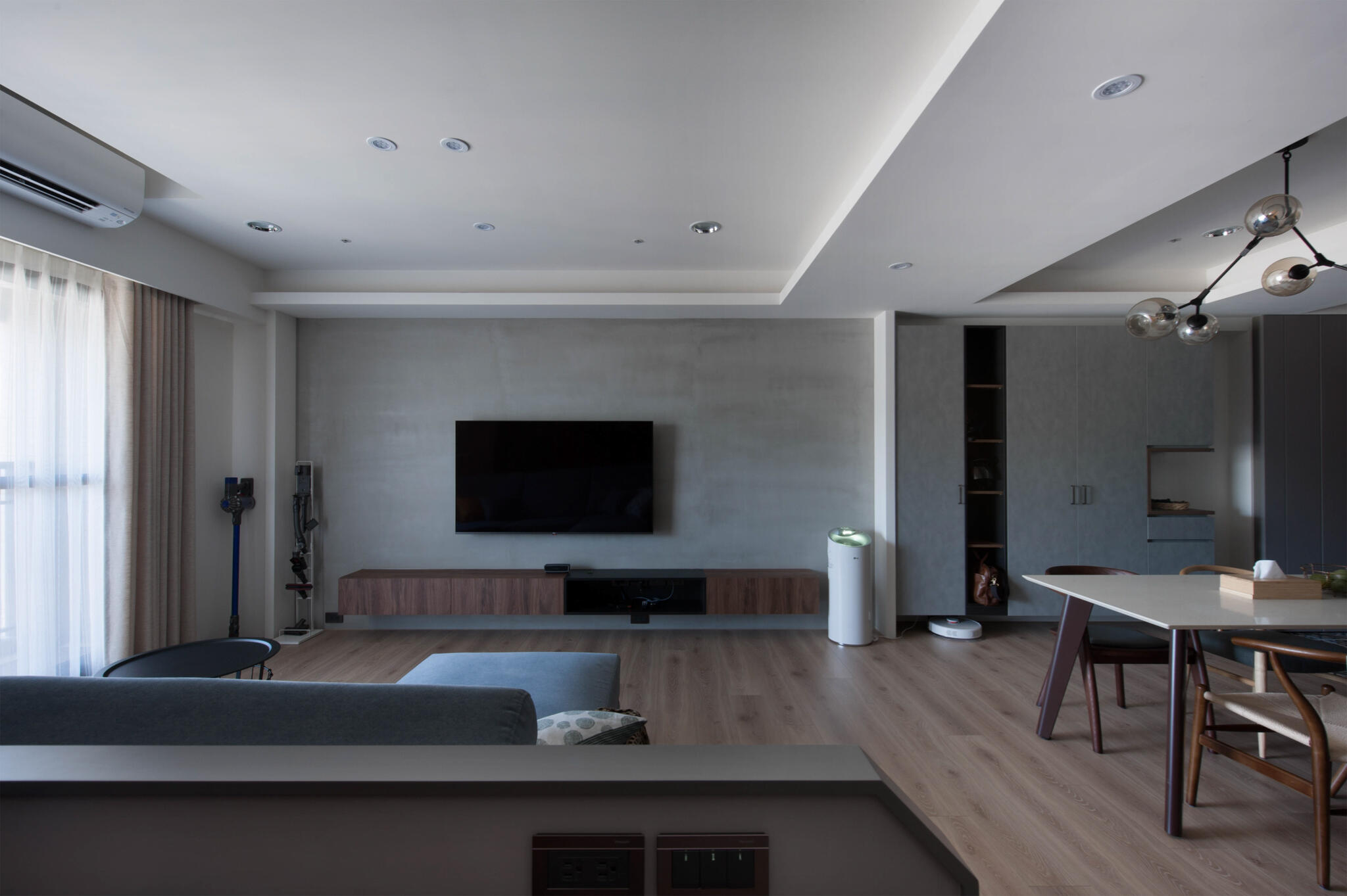 灰色與木色共同構成清新柔和的空間,大器又不失簡約,充滿自然氣息,玄關處設置落塵區與大片櫃體達成高效收納,並透過不同質材鋪敘遞延轉進各場域,客廳牆面以灰色漆料呈現曠野般的原始自然,搭配原木色木地板構築溫暖的肌理注入人文溫度,客廳旁即是用餐區,白底灰紋大理石檯面延續至開放空間在空間中製造延續的視野,餐桌上的互動也讓生活情感持續加溫。隨著自然木紋在廊道蔓延,將空間帶入溫潤舒適感,遞延至臥室營造別具質感的舒心空間。