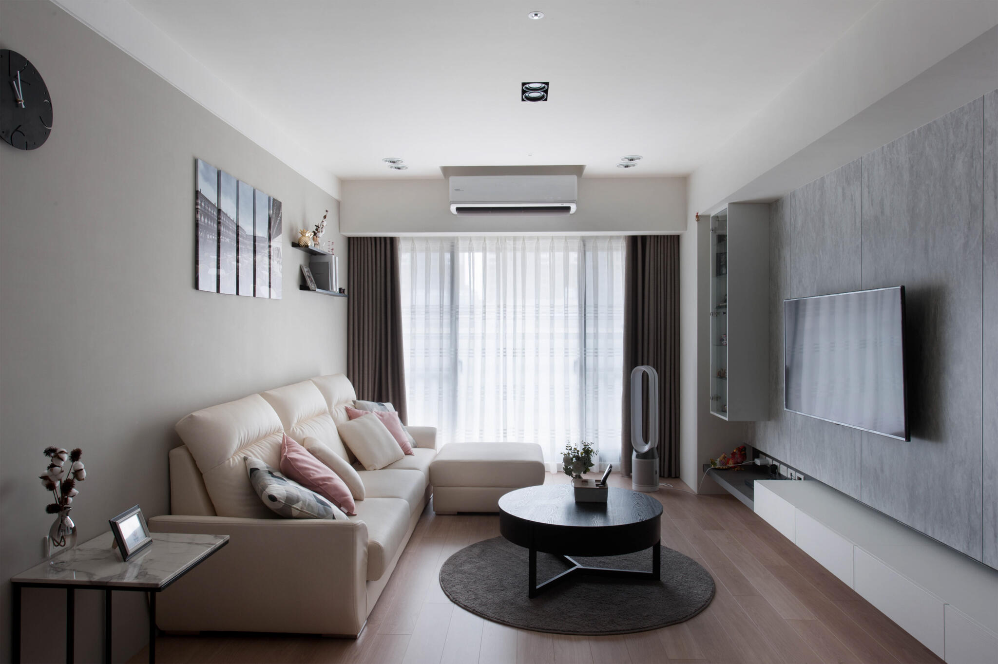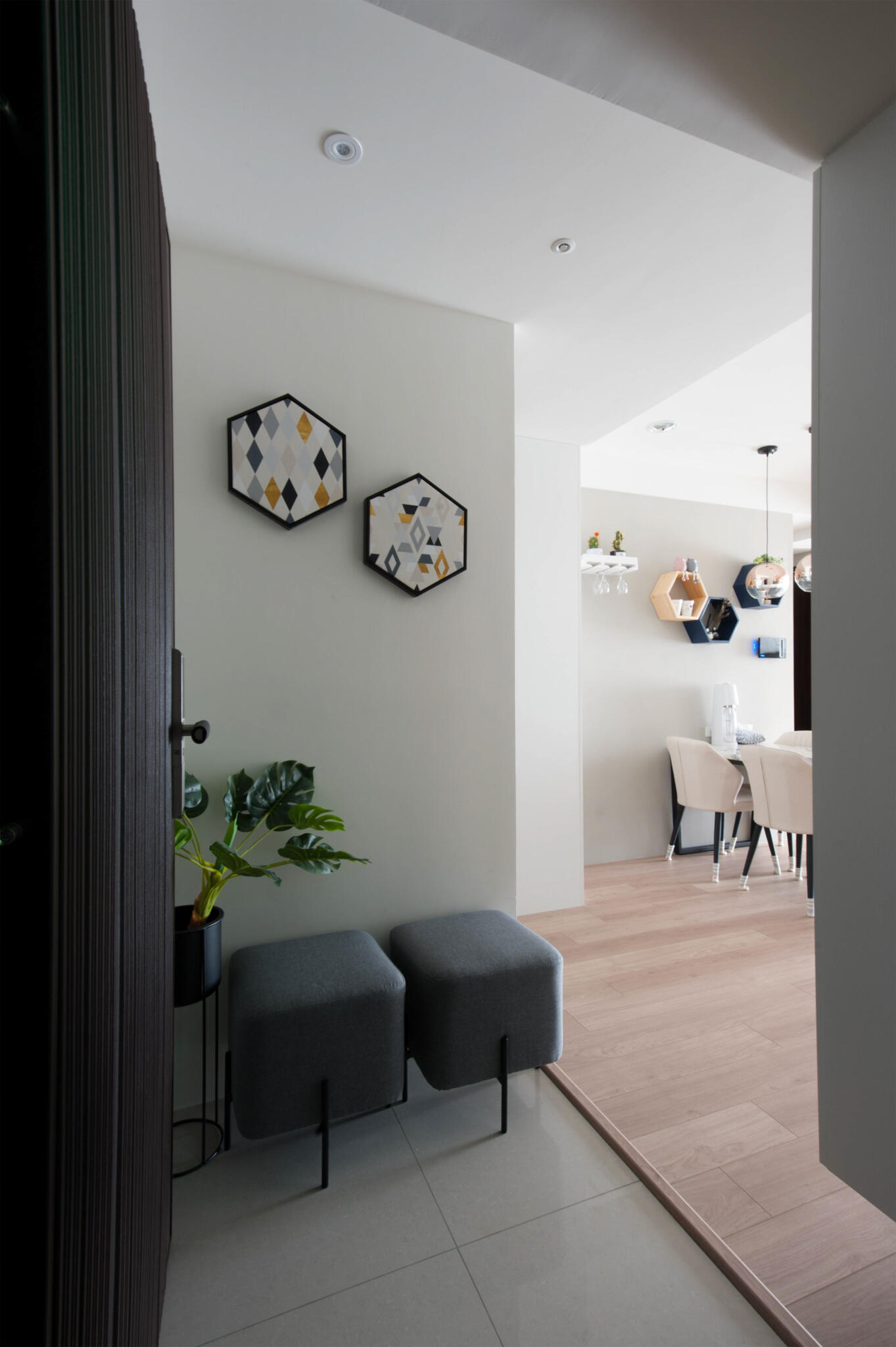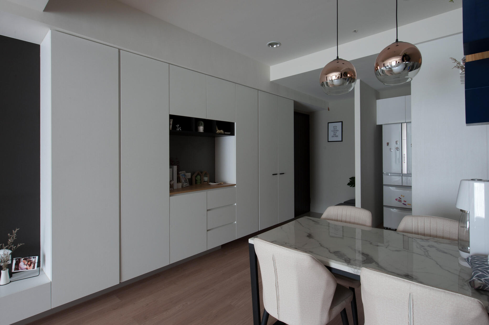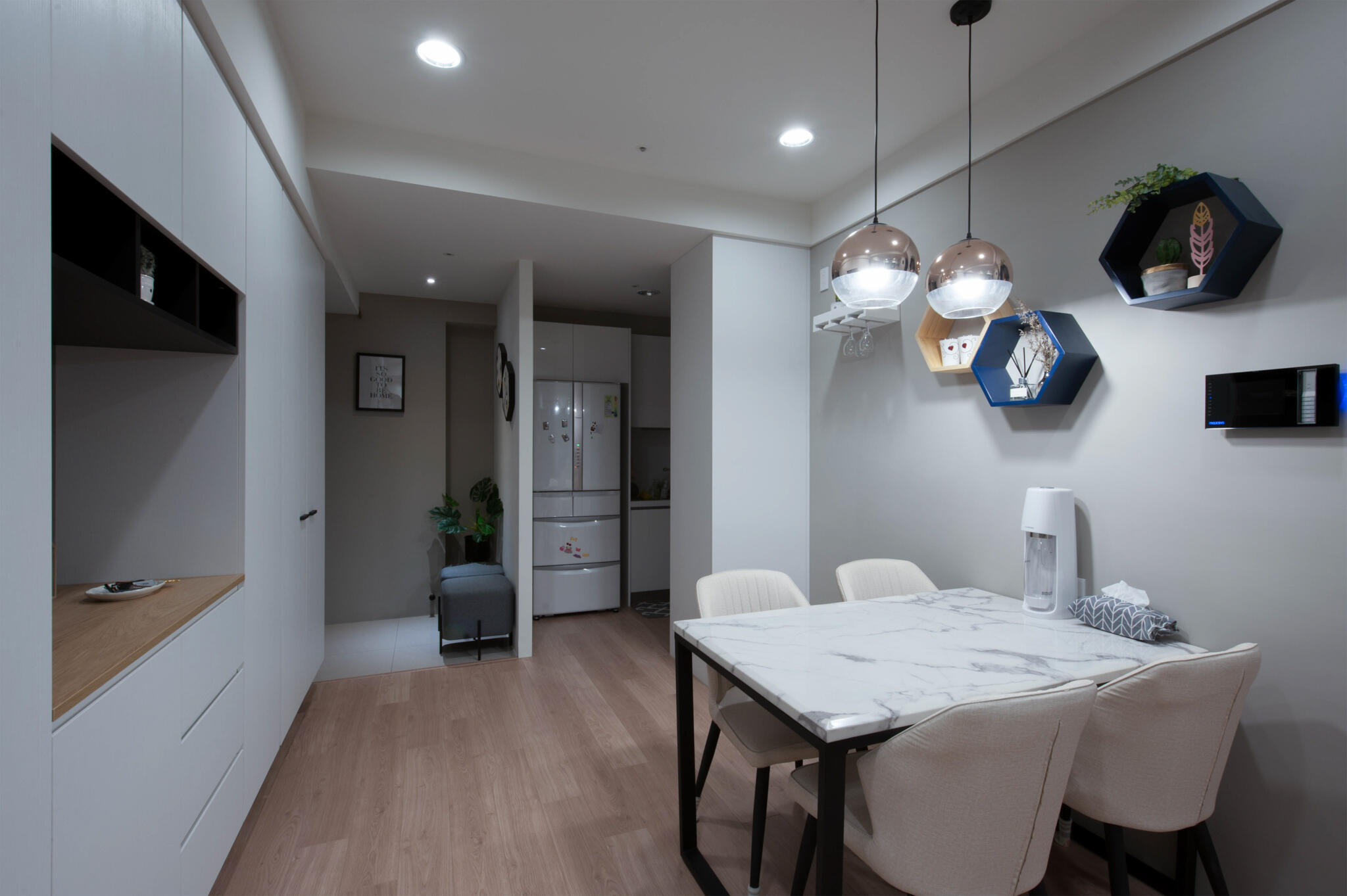 空間以大量的白為基底,搭配淺色木頭紋理充盈清新溫暖的人文氛圍,運用簡單的幾何圖形,點綴牆面增添活潑在格局簡單方正的空間內,以大片的收納櫃運用樸素溫潤的木元素與軟裝堆疊,搭配淡雅色調營造溫馨,完美體現一般小家庭對於居住宅的想像,讓美好一天由宅開始。