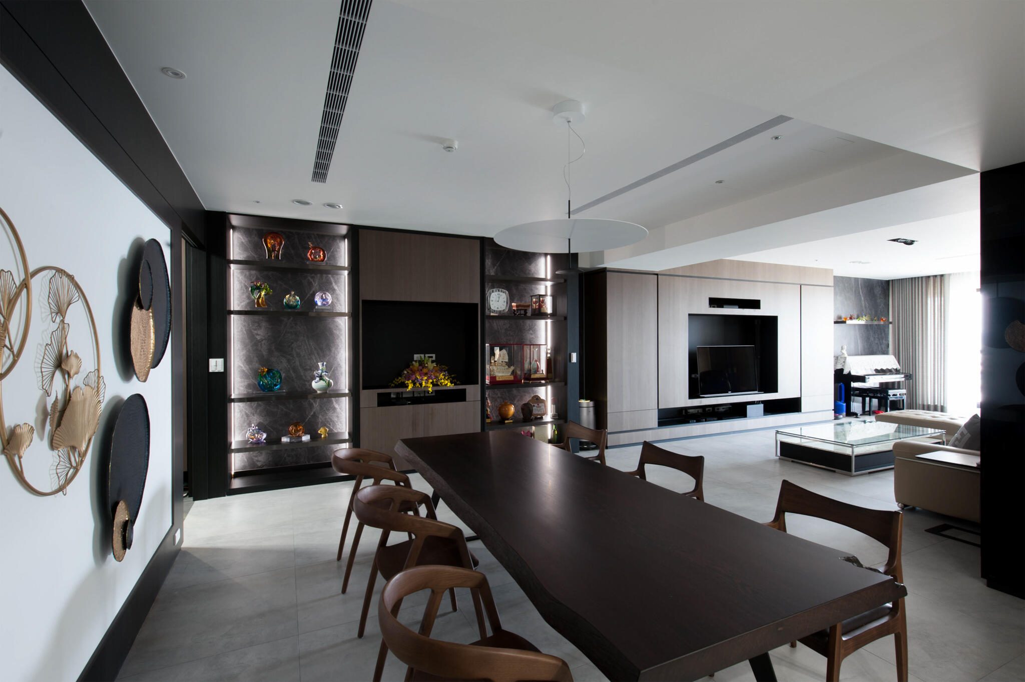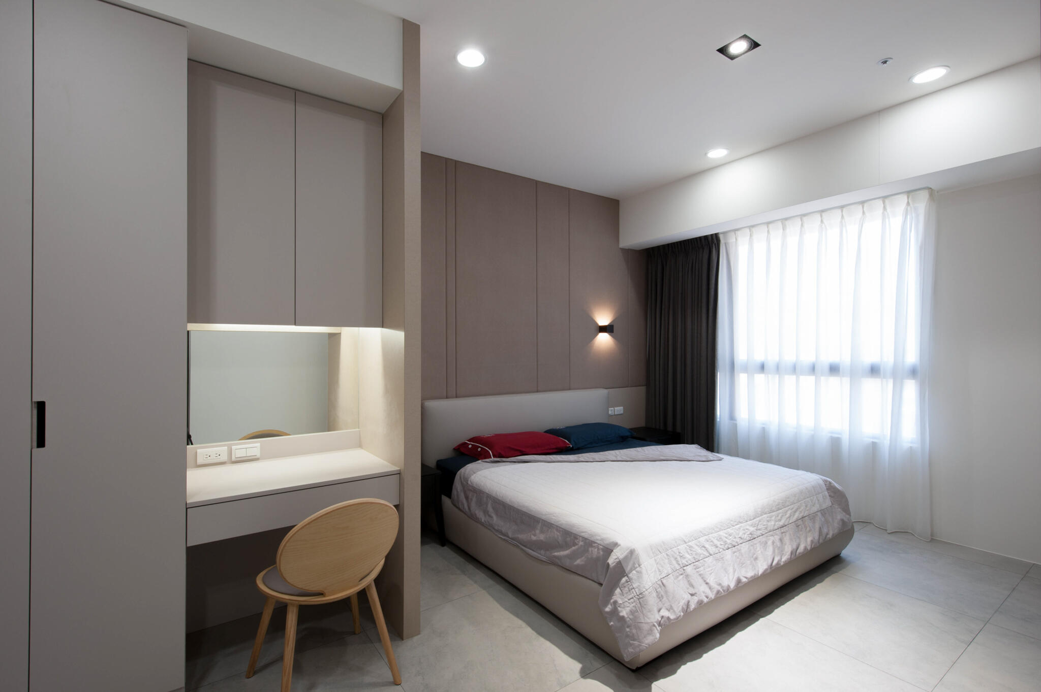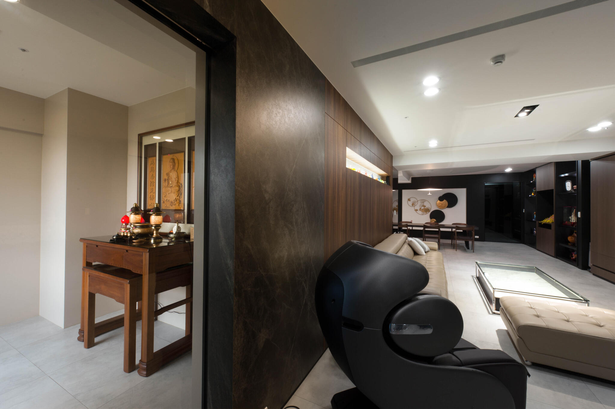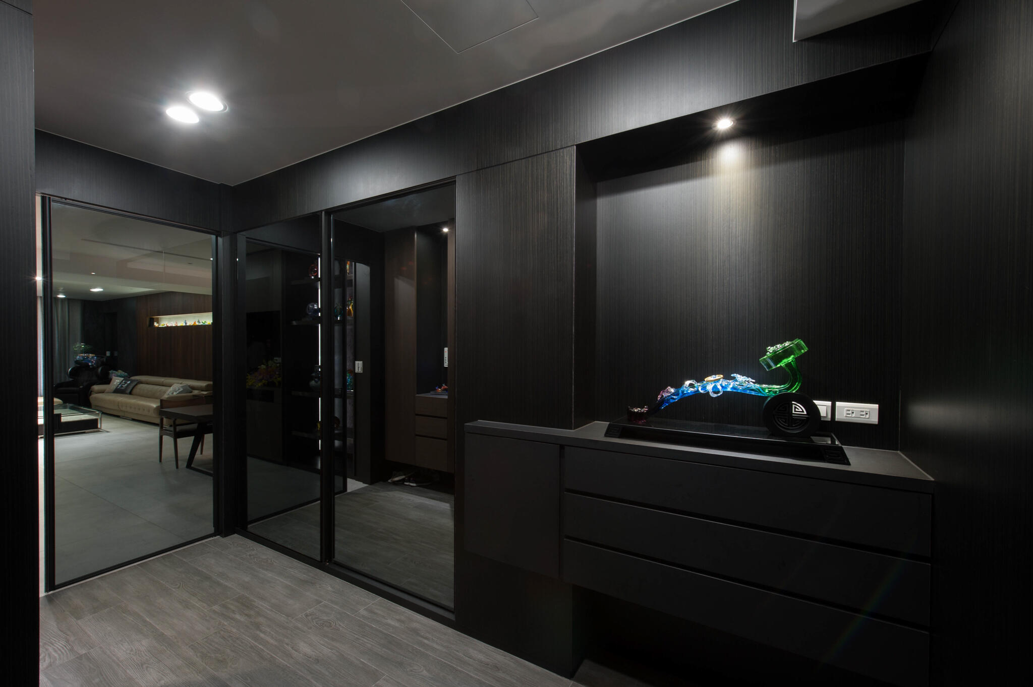 整體風格以簡單的色調與元素呈現現代都會時尚風格,玄關區運用沉穩的木紋,黑鏡串連簡潔俐落的櫃體,大量的隱藏式收納櫃,在視覺上帶來舒適整潔的感受,搭配業主喜好的琉璃收藏納入考量規劃,為屋主的收藏擺放適當位置,使其收藏與整體空間相呼應,替靜謐低調的室內空間畫龍點睛,詮釋現代都會的居家氛圍。臥室以純白色系為基底,加上暖色調的灰鋪排層次,大地色系描繪沈穩舒適的休憩空間。