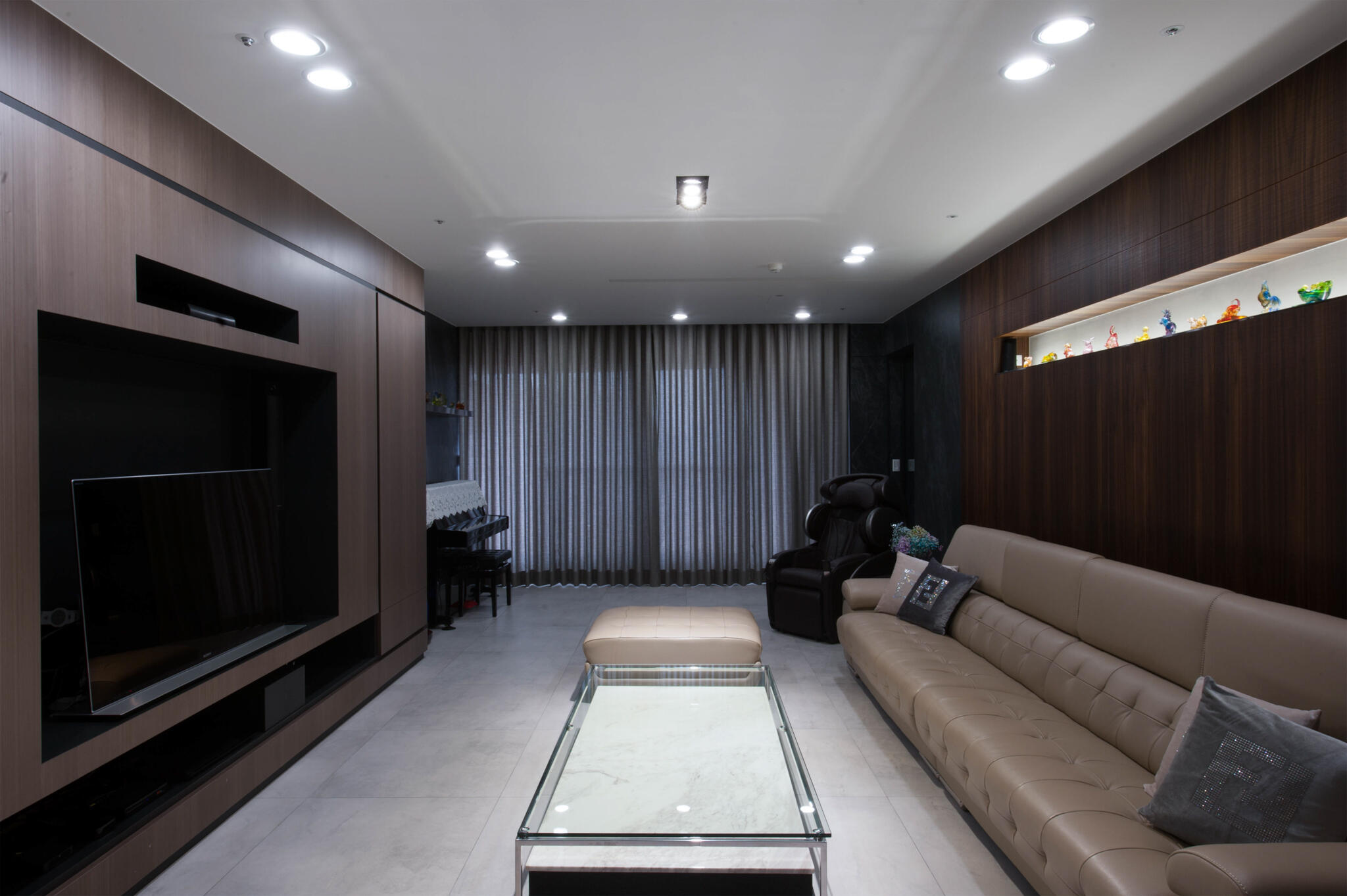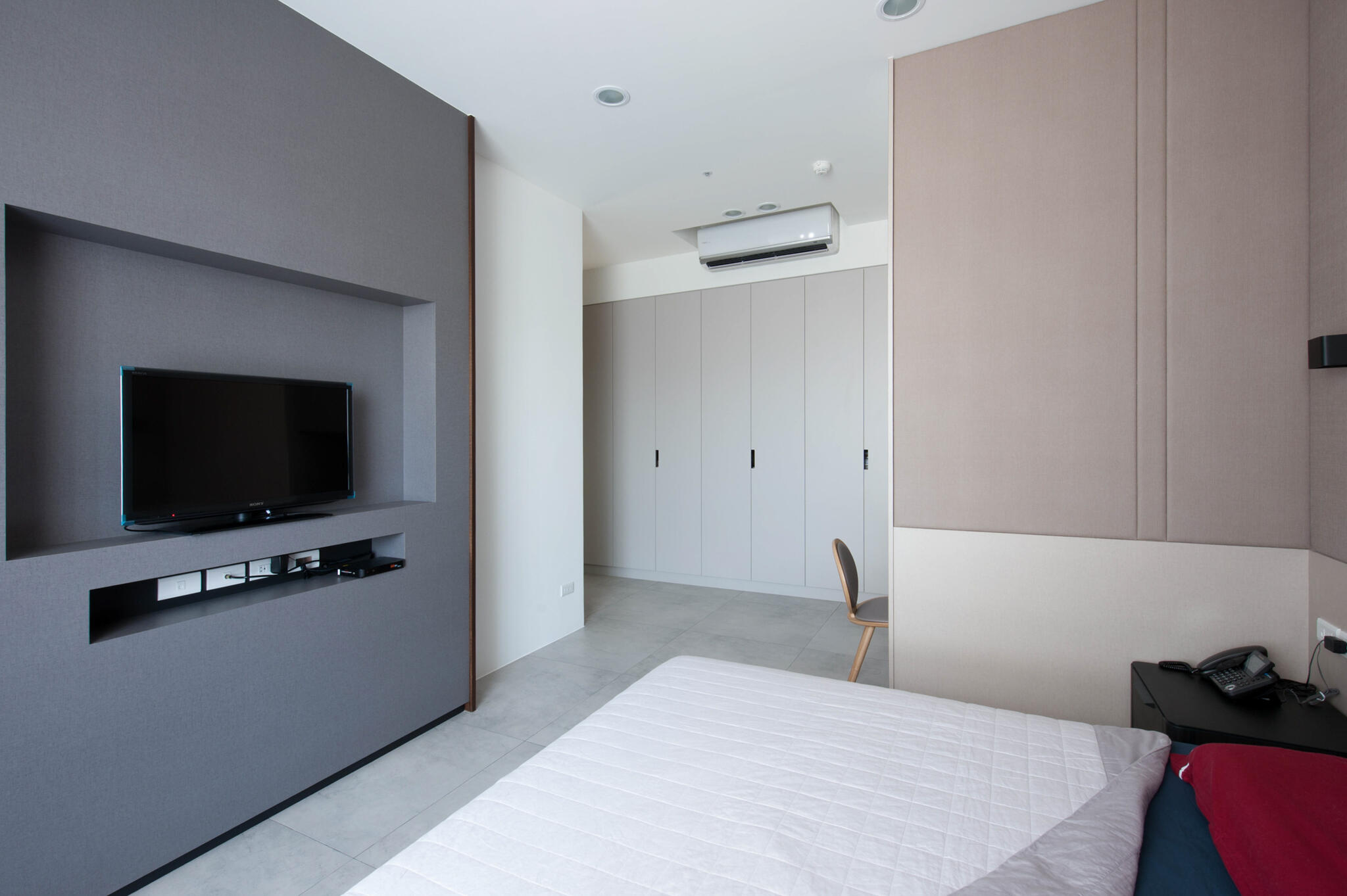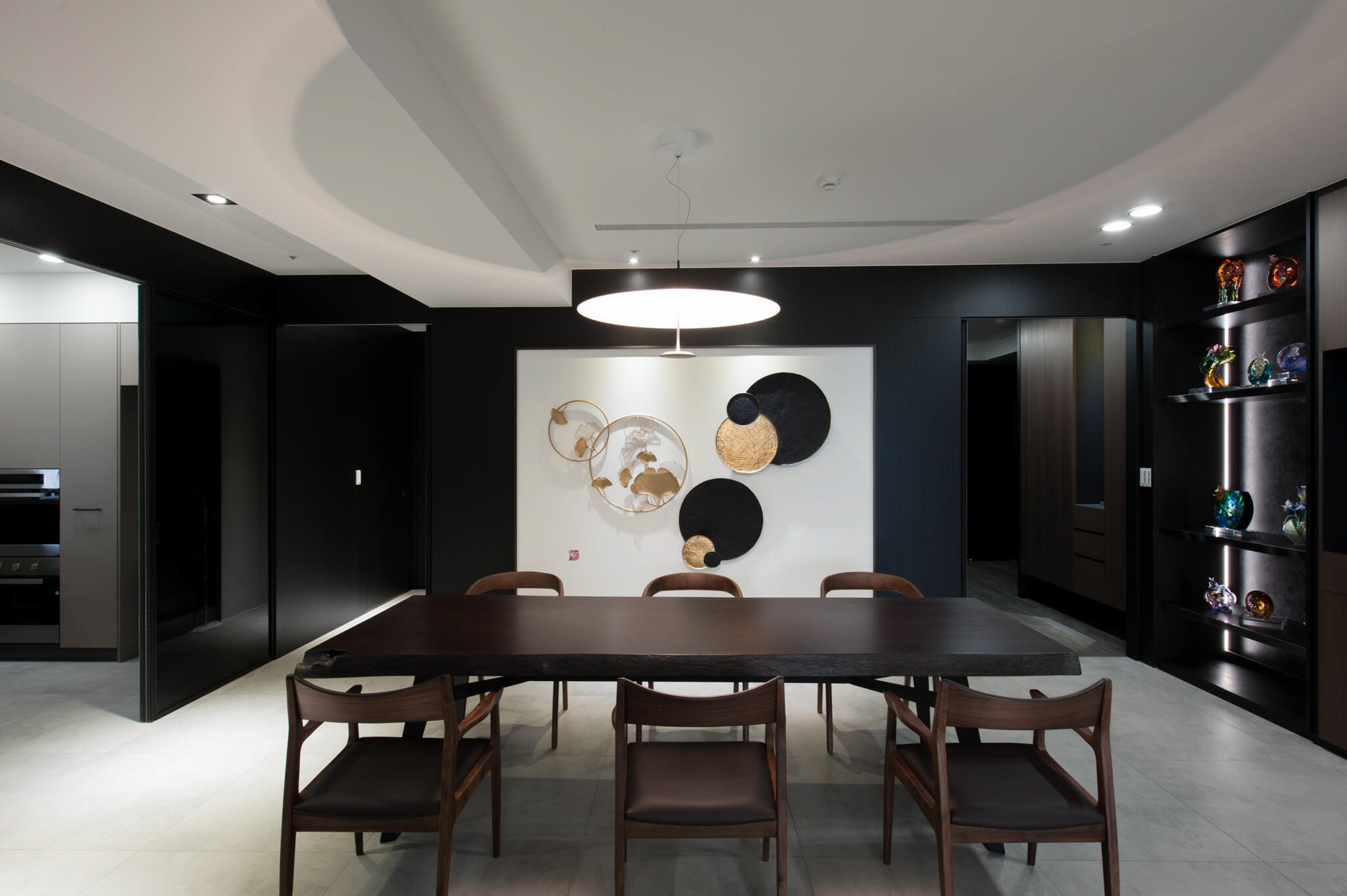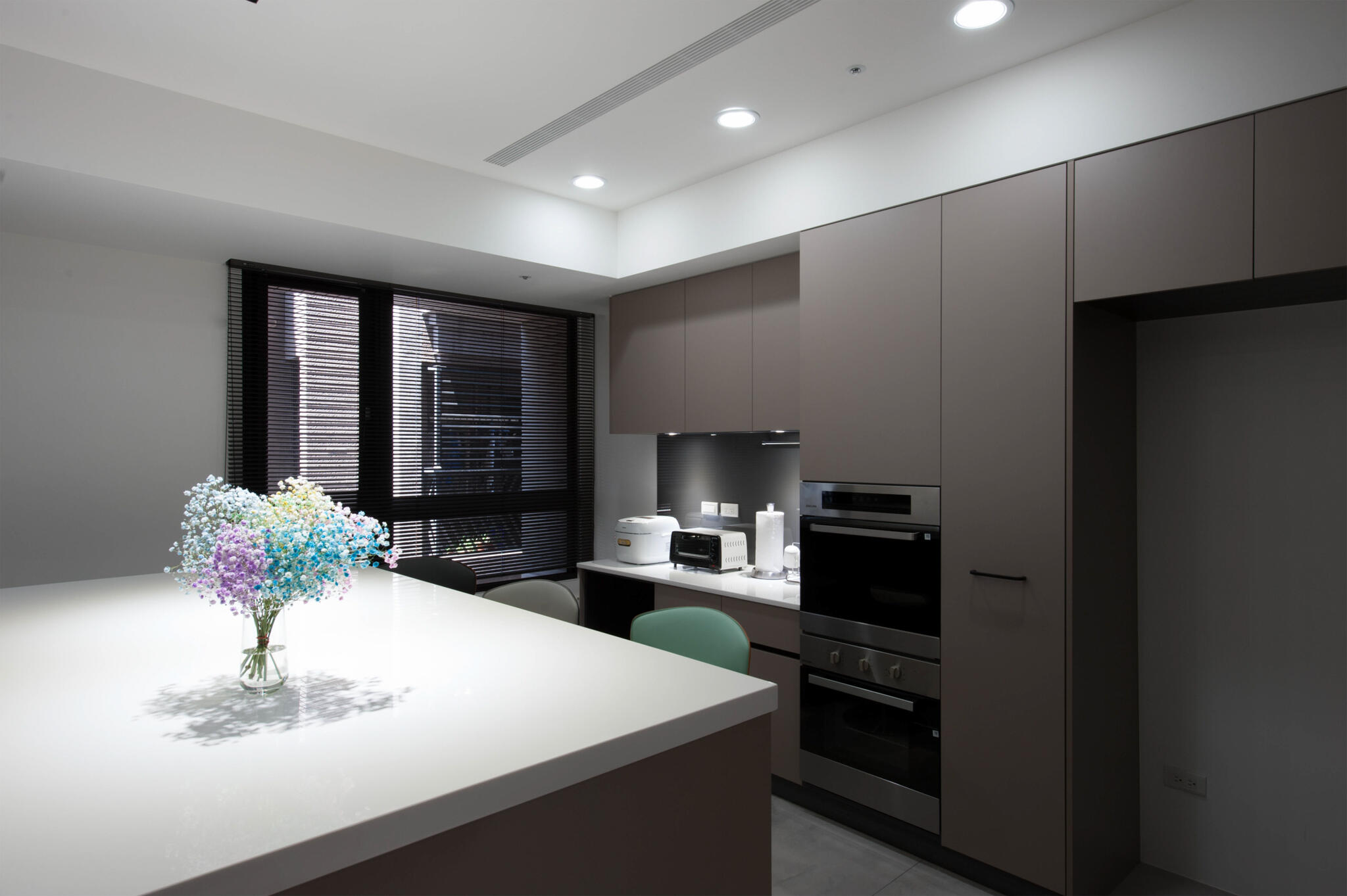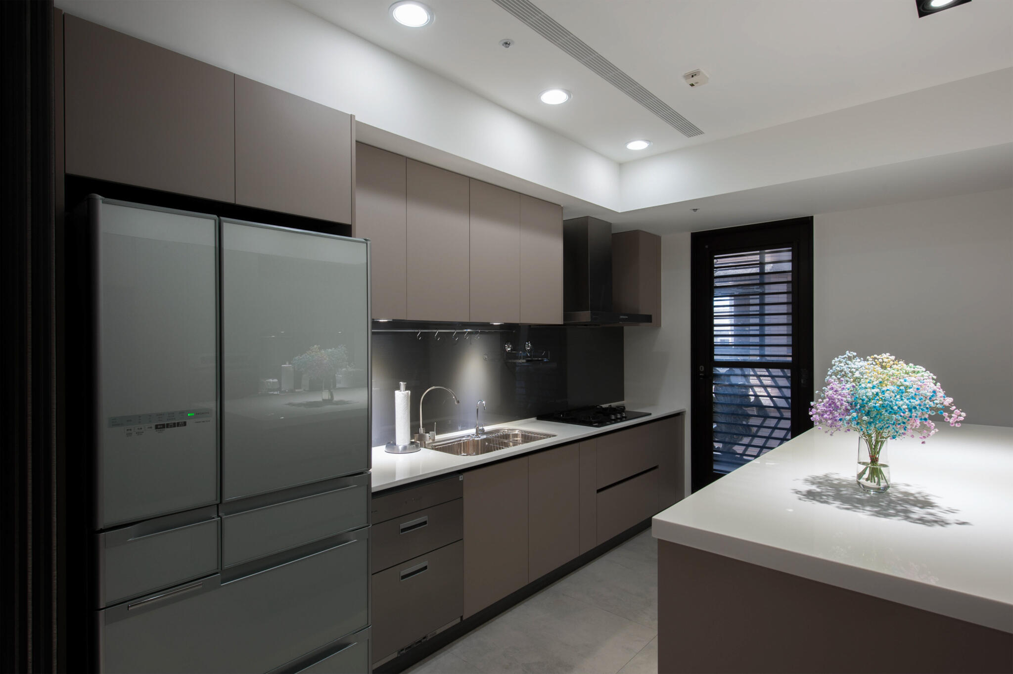 整體風格以簡單的色調與元素呈現現代都會時尚風格,玄關區運用沉穩的木紋,黑鏡串連簡潔俐落的櫃體,大量的隱藏式收納櫃,在視覺上帶來舒適整潔的感受,搭配業主喜好的琉璃收藏納入考量規劃,為屋主的收藏擺放適當位置,使其收藏與整體空間相呼應,替靜謐低調的室內空間畫龍點睛,詮釋現代都會的居家氛圍。臥室以純白色系為基底,加上暖色調的灰鋪排層次,大地色系描繪沈穩舒適的休憩空間。
