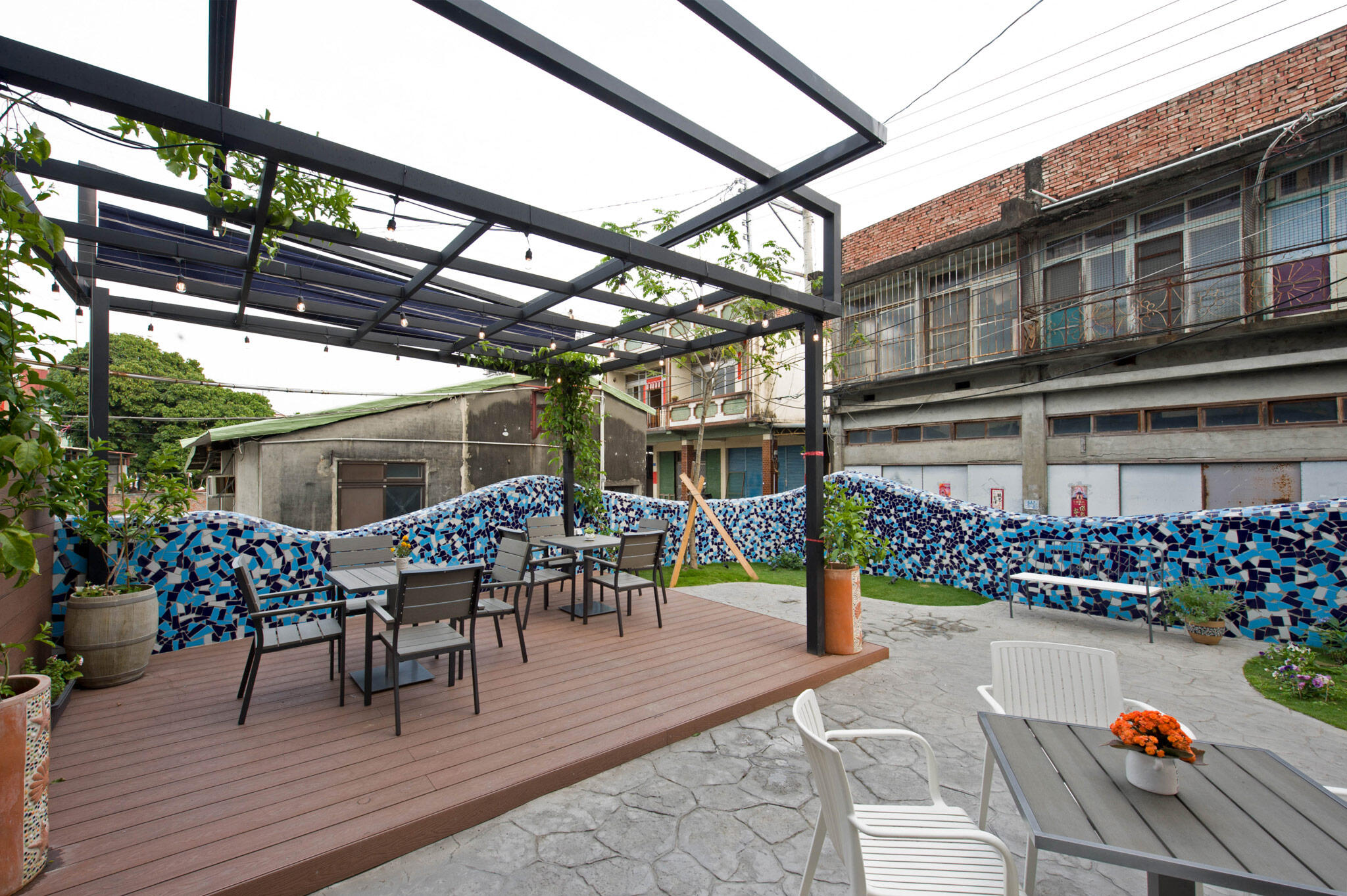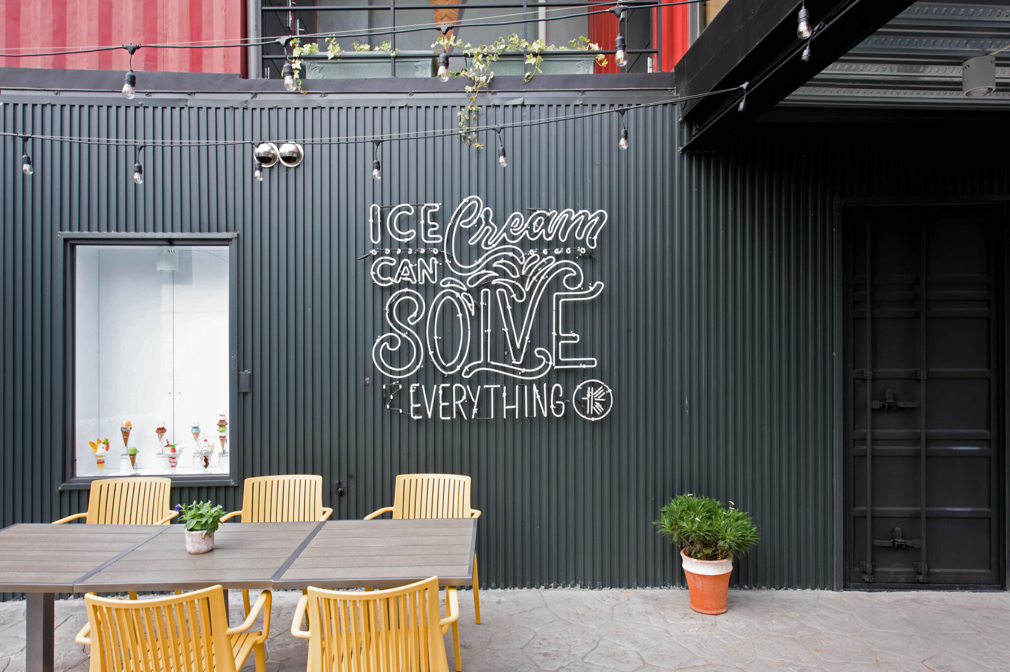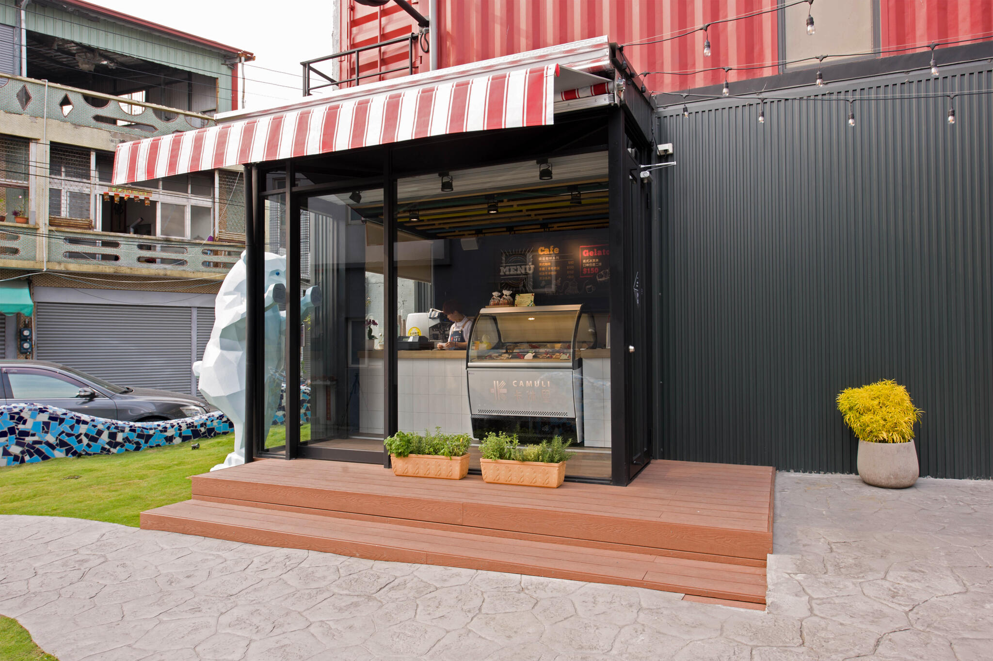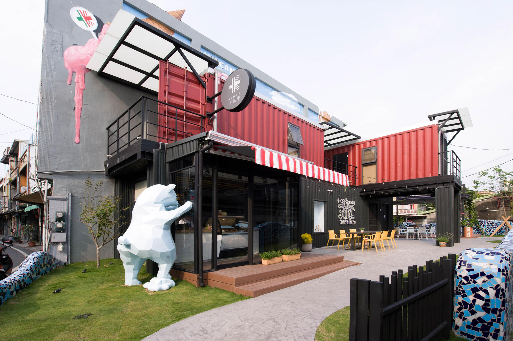 設計團隊以貨櫃屋為靈感,透過垂直交疊方式框構出敞朗挑高的建築,整體建物襯著彩繪牆,佐以戶外綠地花草,打造出充滿異國風調的冰淇淋專賣店。